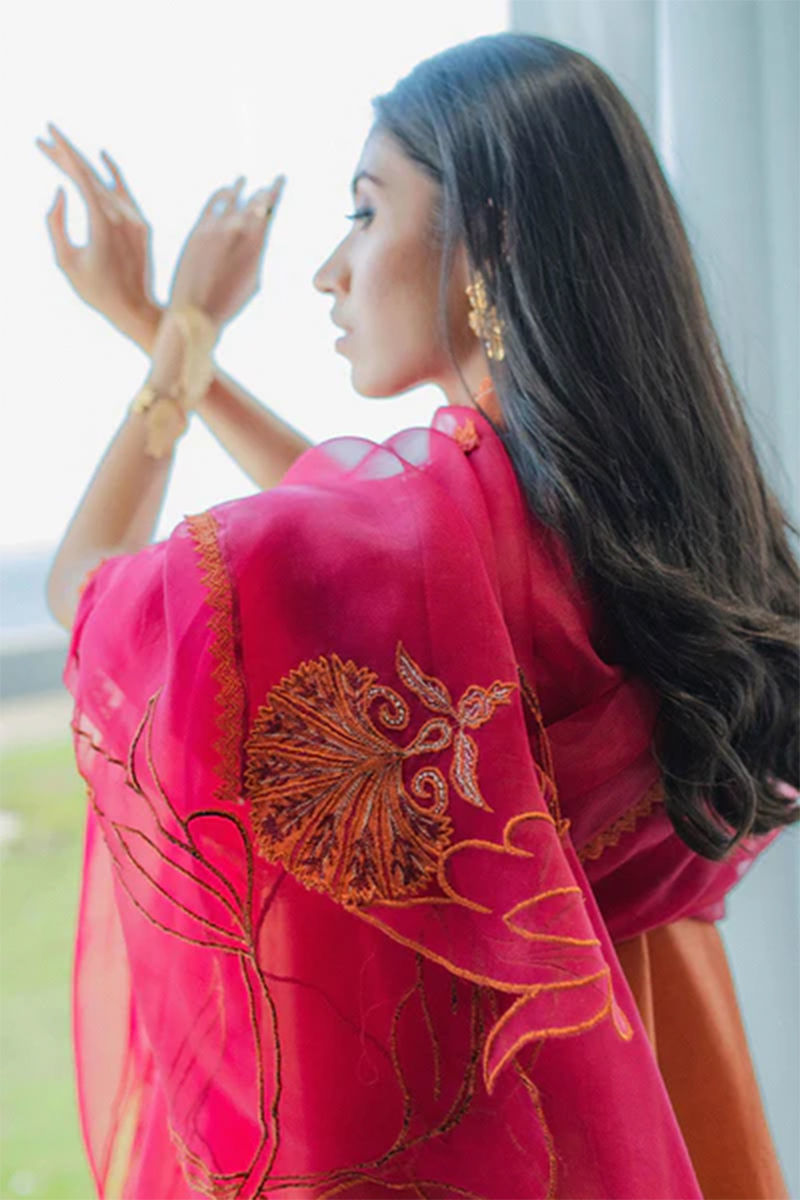 Turn heads in these vibrant hues of tangerine and berry red. Pure raw silk A-line sleeveless long shirt is an amalgamation of appliqués, threadwork, and different embroideries. Defined cutout and embroidered dupatta finished off with laces bring out the whole look and the Voluminous Crushed silk Dhaka gives that flair. This outfit comes along with the shirt and pantsShirt: Raw SilkDupatta: Raw Silk
