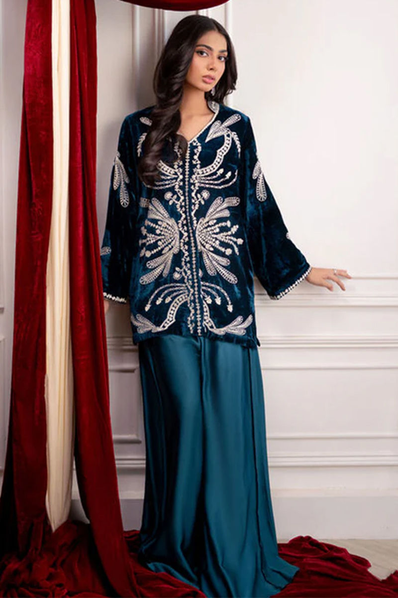 A deep blue velvet short shirt adorned with intricate aari embroidery, enhanced with a subtle sparkle of Swarovski crystals for added shine. Paired with a pleated dhoti skirt, this ensemble blends classic craftsmanship with contemporary elegance — perfect for festive and formal occasions. Shirt Length: 30''Model Height: 5'8