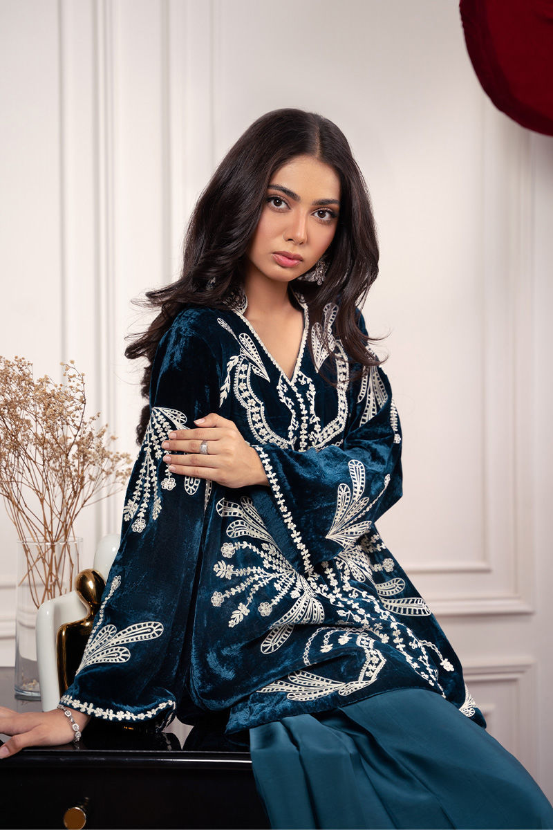 A deep blue velvet short shirt adorned with intricate aari embroidery, enhanced with a subtle sparkle of Swarovski crystals for added shine. Paired with a pleated dhoti skirt, this ensemble blends classic craftsmanship with contemporary elegance — perfect for festive and formal occasions. Shirt Length: 30'' Model Height: 5'8