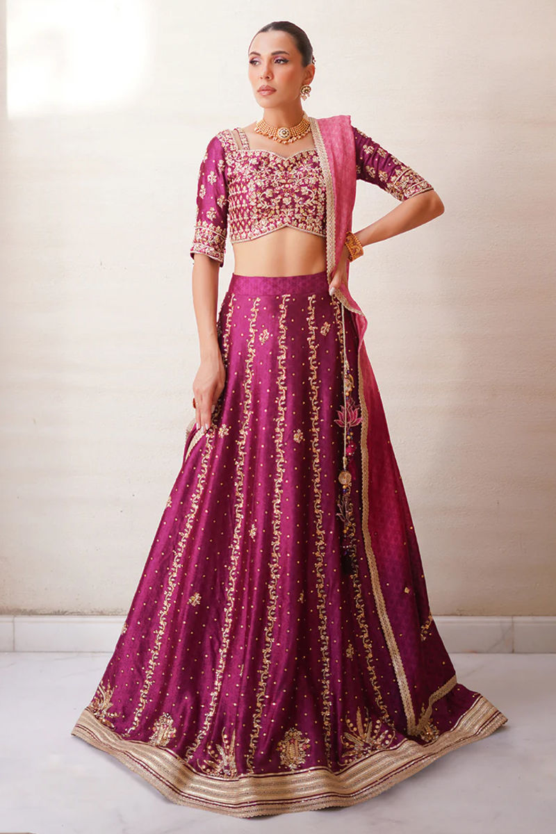 An exquisite creation, this plum lehenga choli is crafted in sheesha silk, radiating a lustrous elegance. The choli lehenga are beautifully adorned with intricate handwork of dabka, gota, sitara, and resham, finished with delicate gota accents and tassel detailing on the lehenga for a regal touch. Paired with an ombre three-toned dupatta, embellished with matching handwork and refined lace finishings, the ensemble strikes the perfect balance between grandeur and finesse. A timeless silhouette reimagined with artisanal mastery, making it a true statement bridal look. Lehenga: Sheesha Silk Choli: Sheesha Silk Dupatta: Sheesha Silk
