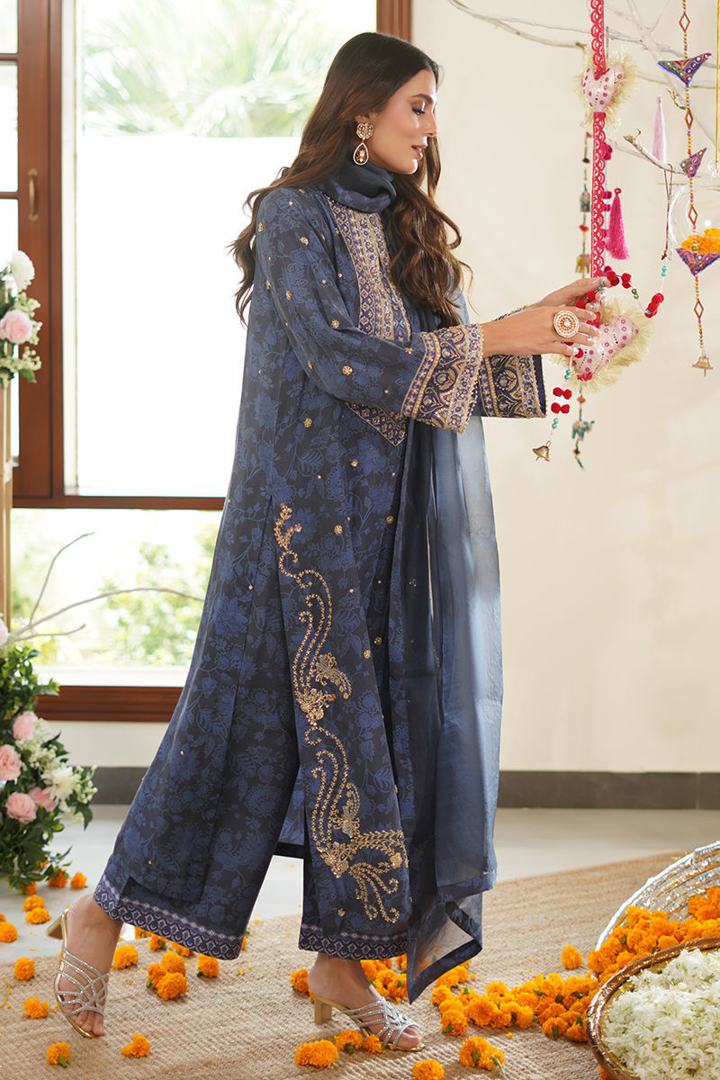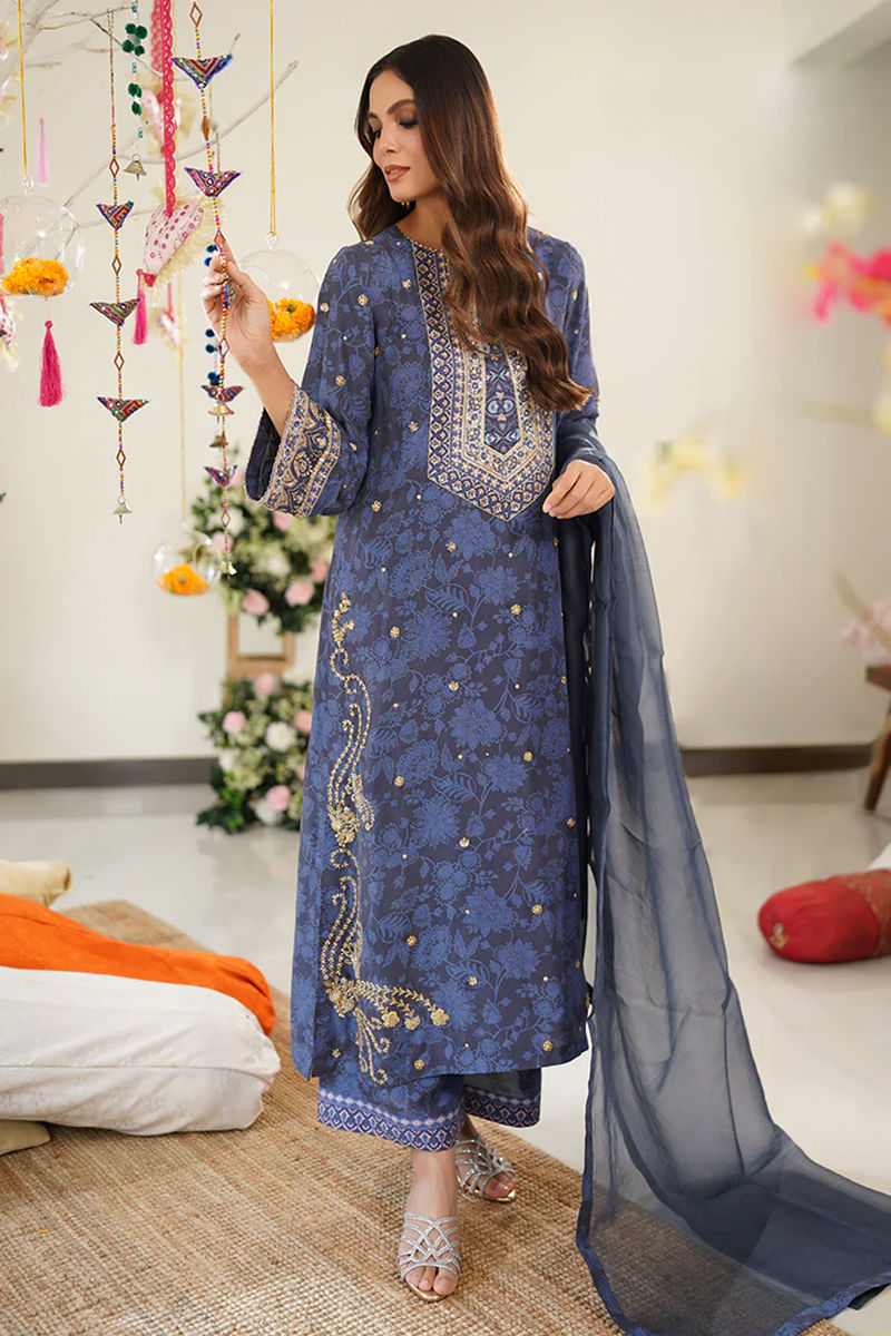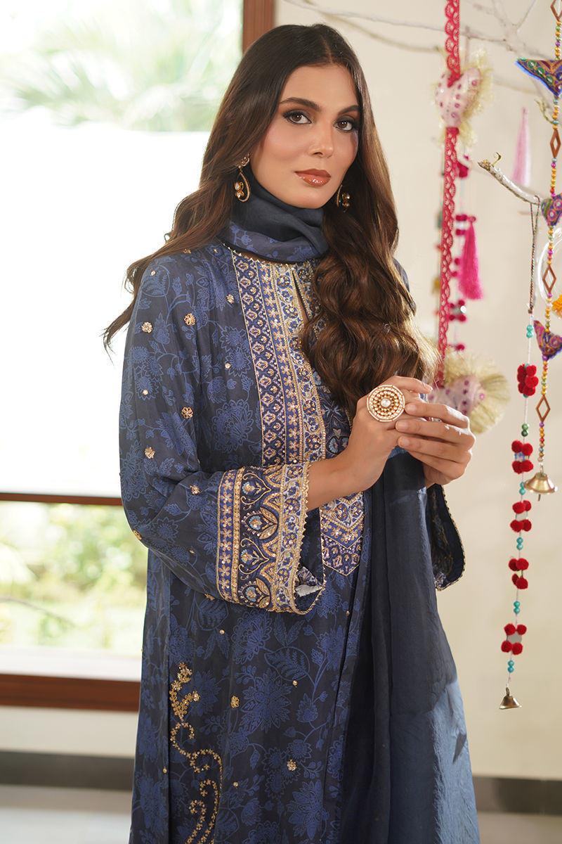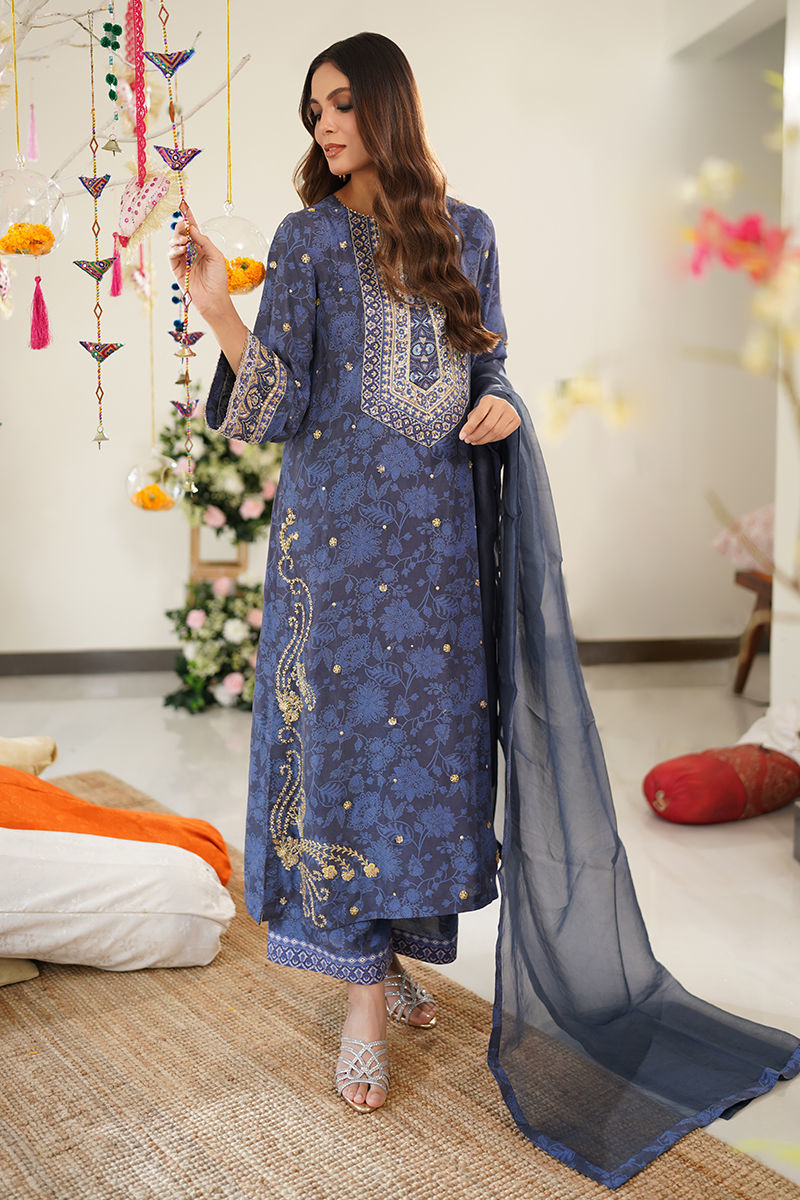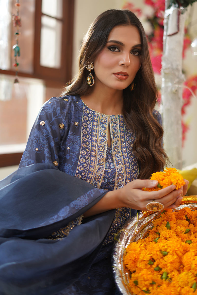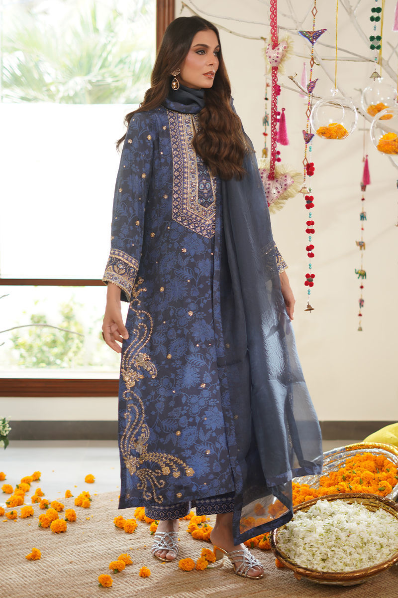 A timeless statement in shades of blue, this outfit is crafted from pure raw silk with an intricate self-print that adds depth and texture. The shirt features a beautifully detailed neckline, adorned with exquisite hand embellishments using kora, dabka, and Swarovski stones — extending gracefully along the side slits for a luxurious finish. The matching izaar, tailored in the same self-printed raw silk, ensures a cohesive and elevated silhouette. Pair it with the optional organza dupatta, finished with printed borders, for an added layer of elegance and sophistication. A perfect blend of classic craftsmanship and modern design. Shirt maximum length: 52 Model height 5’11 Shirt: Pure Raw Silk Dupatta: Organza Pant: Pure Raw Silk