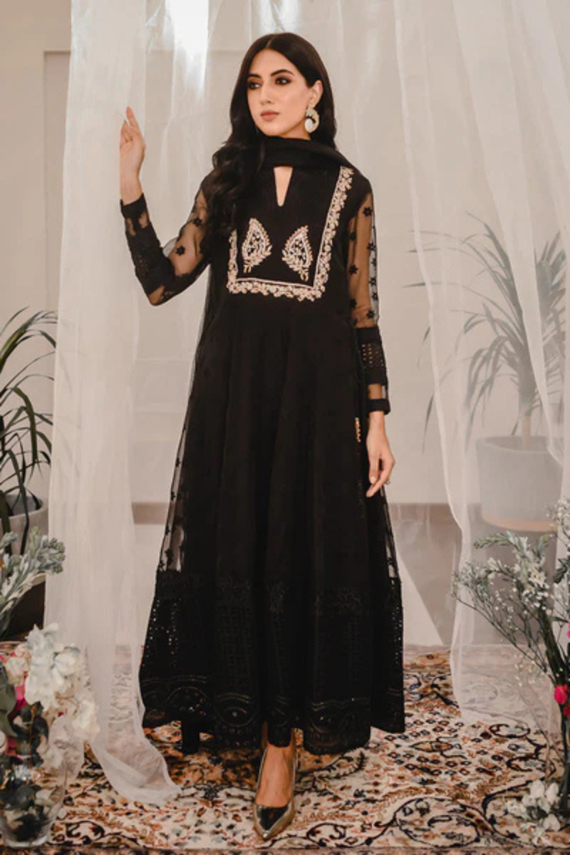 SEASON’S MUST HAVE - A classic black kalidar in fully embroidered organza. Lilya design is played around with a range of fabrics, laces, and embroideries to make it drool-worthy. The bodice is fully handworked with zardozi, making it fit for any intimate occasion. Paired with an organza dupatta with lace and schiffli detailing. Pair it with our signature pants to complete the look. *It comes with a organza dupatta.