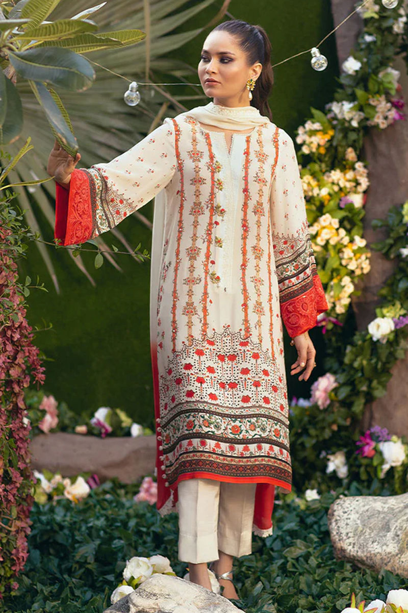 Each print is designed in-house at Amna Arshad Design House with close attention to detail and quality. This relaxed silhouette and soothing color tones are a wardrobe must-have. A classic modern neckline with handwork motives and lace detailings. Sleeves are detailed with embroidered tangerine borders. The shirt is sprinkled with pearl detailing. Off-white and tangerine two-tone dupatta with lace finishing. Shirt pure crepe silk dupatta tissue silk add on pure Raw silk pantsShirt: Pure Crepe SilkDupatta: Tissue Silk