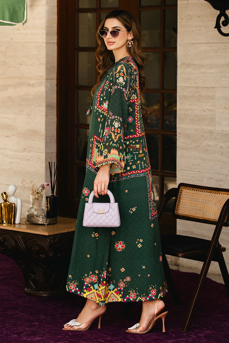 Discover effortless sophistication with this deep green crepe kaftan kurta, designed to captivate with its intricate textile print. The kaftan features a rich deep green hue adorned with a sophisticated blend of linear elements, florals, and geometric patterns, creating a visually dynamic yet harmonious design. The crepe fabric’s luxurious drape enhances the kaftan's flowing silhouette, providing both comfort and elegance. Paired with the kaftan are pure raw silk pants in a complementary deep green shade, which add a touch of opulence and complete the ensemble with a polished, cohesive look. Styling tip: you prefer something more functional, choose a chic crossbody bag in a neutral shade like beige, cream, or metallic. Shirt: Crepe Silk