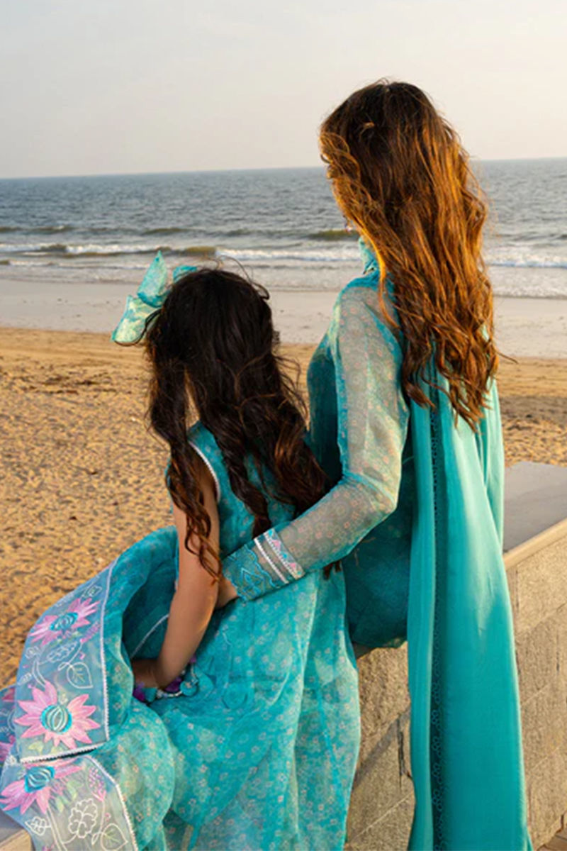 Super festive mini me aqua blue printed angrakha with kingri detailing. embroideries on flair and inhouse cute tassles. Twirl around and style your girlies this season in this outfit. Pants are on silkShirt: OrganzaPant: Organza