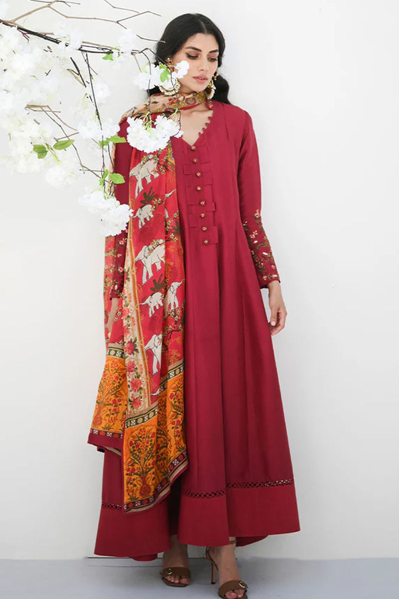 In a deep shade of ruby pure Raw Silk kalidar, with exuberant volume making you feel no less than a Queen. We have delicately embroidered the sleeves and collar with embroidered buttons and swarovski crystals to make you stand out! The silk duppata is beautifully printed in rich hues and prints making it one of our finest till date.Shirt: SilkDupatta: SilkPant: Silk