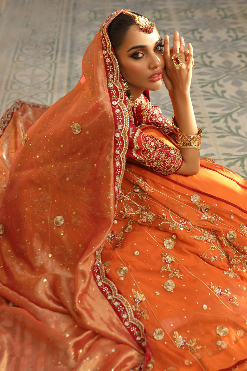 A traditional vibrant tone of burnt orange kalidar with pure raw silk crimson bodice . The kalidar is perfect for a mehndi bride . It is fully handworked with signature Amna Arshad details with kora dabka sprinkled with Indian gota .and a luxurious pure tissue dupatta complements the whole look., Fully loaded with kamdani bootiies and 4 sided hand worked border duppata. Ooh The back is just enough to turn heads around . The peshwas can be paired with our classic pants and gota worked pouch. Designer’s note : Pair your grandma’s jhumkas and choker to be the most beautiful AA mehndi bride!