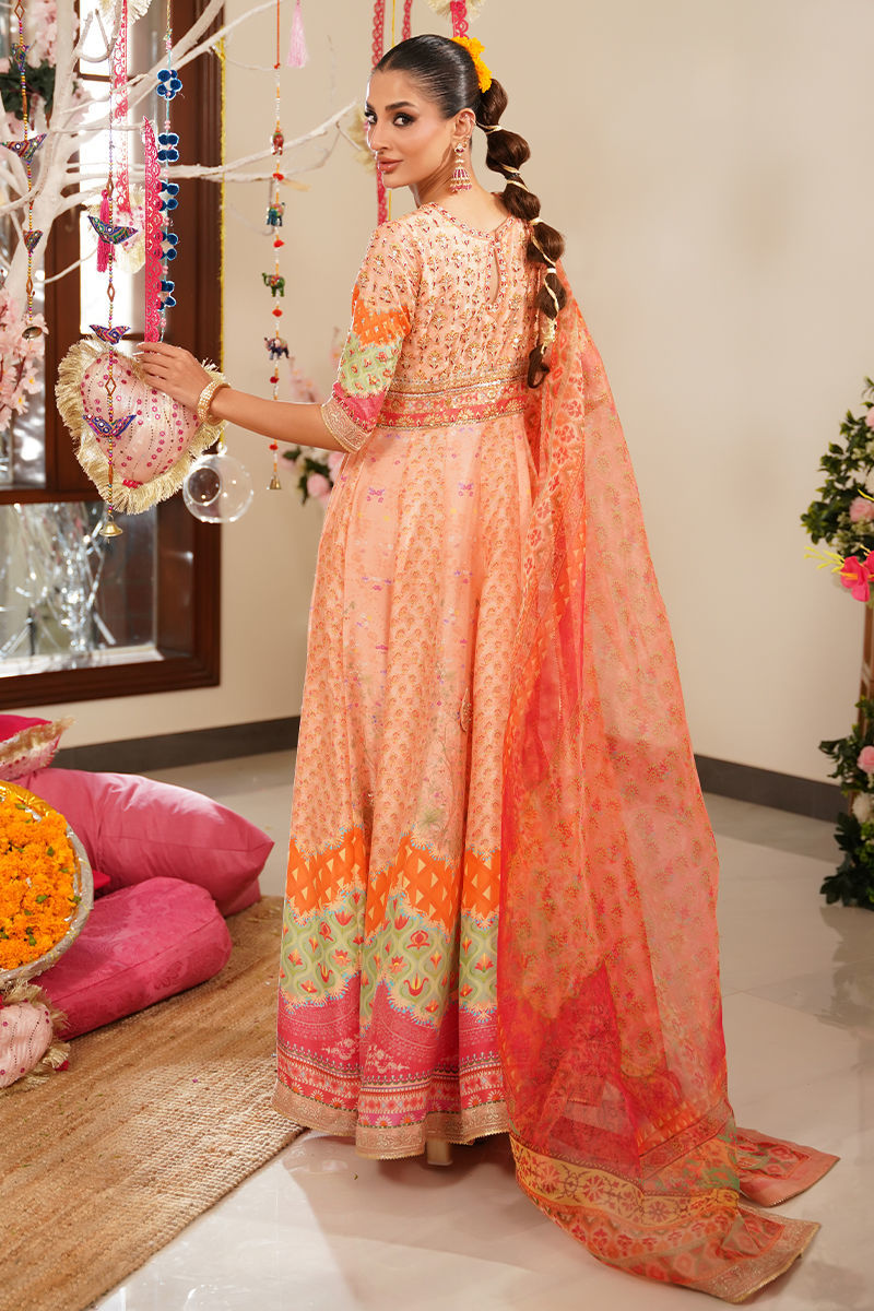 Step into a world of vibrant elegance with this beautifully crafted pink printed pishwas, designed with bold color blocking in shades of pink, orange, and green. The choli is richly adorned with intricate hand embroidery featuring gota, dabka, resham, and shimmering stones, creating a stunning interplay of texture and sparkle. A standout detail is the addition of handworked 3D butterflies delicately placed along the ghera, adding a whimsical and artistic touch to the ensemble. The look is paired with a printed organza dupatta in vibrant, festive hues, offering a light, graceful contrast to the structured pishwas. Complete your outfit with optional straight pants in pure raw silk, available as an add-on, perfect for elevating the ensemble with a refined finish. Shirt maximum length: 55 Model height 5’8 Peshwas: Pure Raw Silk Dupatta: Organza Pant: Pure Raw Silk