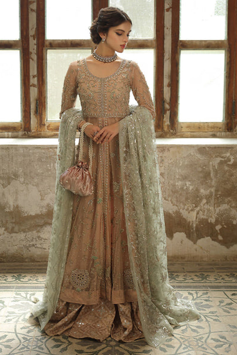 A chai pink tone like this is a treat for eyes. French net front open peshwas with heavy Zardozi work .We love the cutwork details on the hemline and our signature mirror worked beautiful heavy tassels on the back . FULLY worked Soft sage green dupatta with heavy crystal and cutdana details sprinkled all over the dupatta . A jamawar Lehenga is finished with gota and Sheesha work and heavy hand made tassels shows off the back. Can easily say engagement and nikkah Valimahbrides are all sorted for this season.Add on pouch