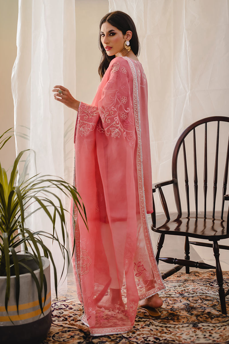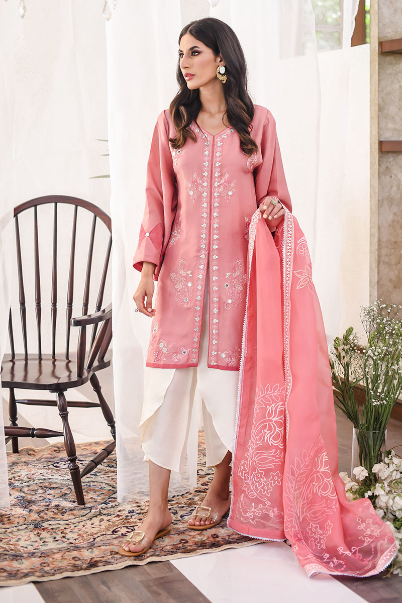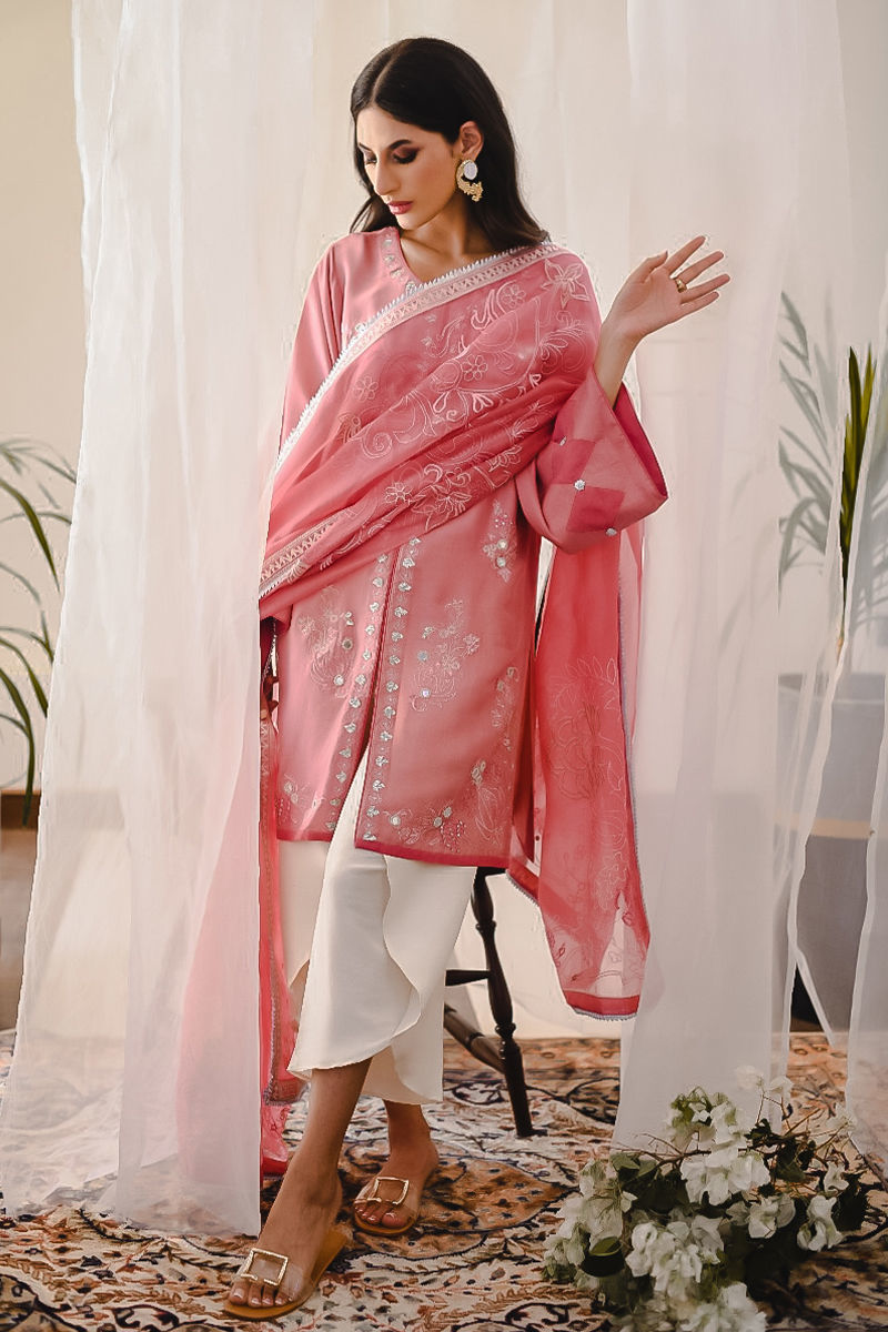 An absolute favorite this season is this front open knee-length kurta in a soothing salmon tone with intricate embroideries all over the shirt with handwork detailing. The sleeves have geometric applique details and gotta handwork. It is paired with dhoti off-white pants and a fully embroidered organza dupatta in contrasting pink.* It comes with our signature pants.Shirt: RawsilkPant: Rawsilk