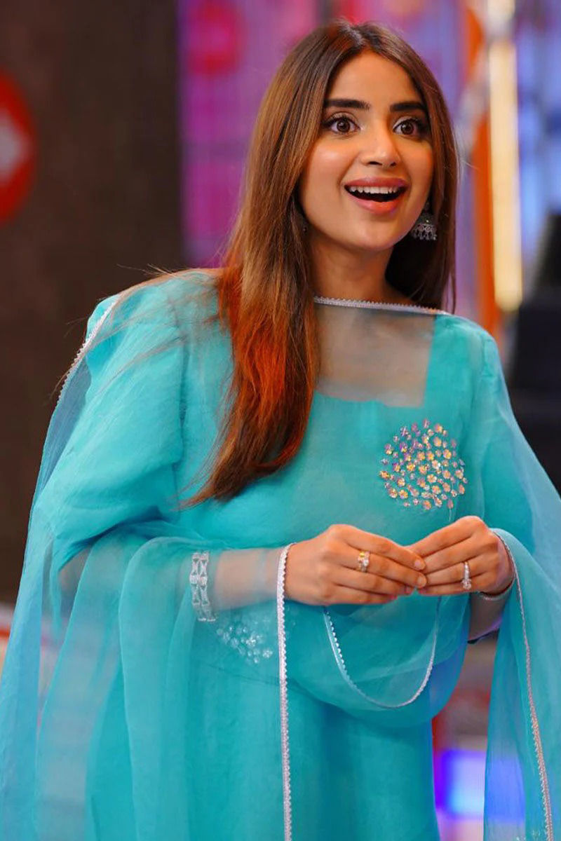 A beautiful shade of turquoise cut in pure silk with statement sleeves, fully hand-embellished shalwar, and pure organza dupatta with sprinkled sitar worn by our favorite style star Saboor Ali. A perfect dress-up or down outfit to wear on any occasion Shirt: Raw SilkDupatta: Raw SilkPant: Raw Silk