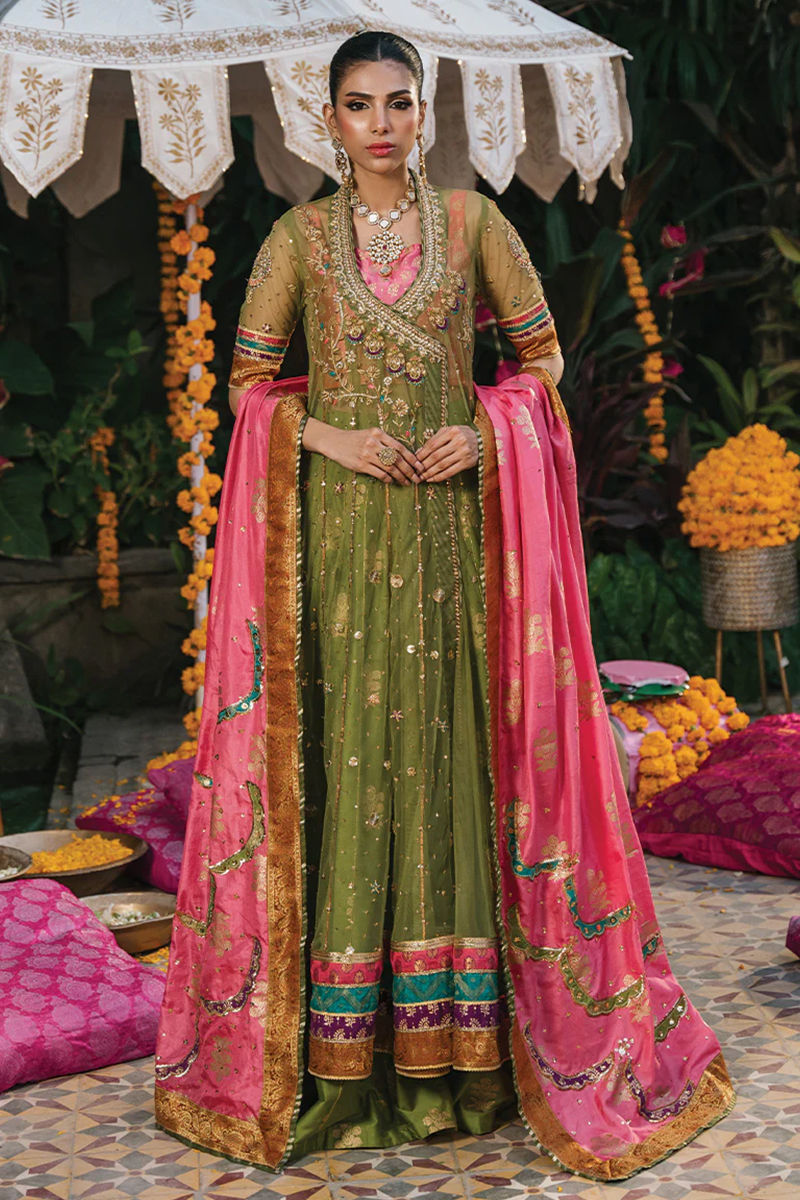 Maliya: This exquisite mushy green net angrakha is a vision of traditional elegance and contemporary charm. The angrakha features a unique wrap-around style that adds a graceful flow to its silhouette. It is adorned with intricate zardozi work, which includes detailed embroidery in gold and silver threads, creating a rich and textured appearance. Pops of colorful resham thread add vibrant highlights, enhancing the depth and beauty of the design. The angrakha is finished with colorful borders and gota detailing at the hem and sleeves, which provide a refined touch and frame the garment beautifully. Beneath the angrakha, a coral pink screen-printed tube provides a striking contrast. The angrakha is paired with a green screen-printed paneled lehenga with gota dori that echoes the mushy green of the angrakha. The dupatta contrasts beautifully with the angrakha and lehenga, crafted in a coral pink screen-printed fabric. It is adorned with appliquéd colorful scallops and detailed sitara work, which adds a layer of elegance and visual interest. Lehenga: Viscous silk Shirt: Net Dupatta: Viscous silk