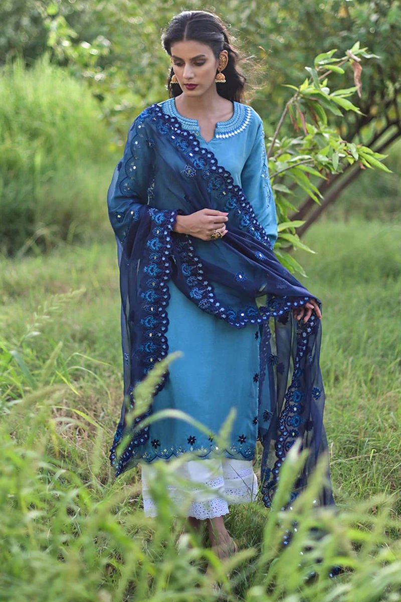 Inspired from the mystiques of simplicity. A classic teal blue shade of raw silk adorned with mirror work and embroideries in shades of blue. We have complemented the look with a beautifully embroidered dupatta with mirror work. It’s a perfect intimate wedding and Eid wear; you can pair it with our signature raw silk pants with chikan detail to complete the look.Shirt: Raw SilkDupatta: Organza