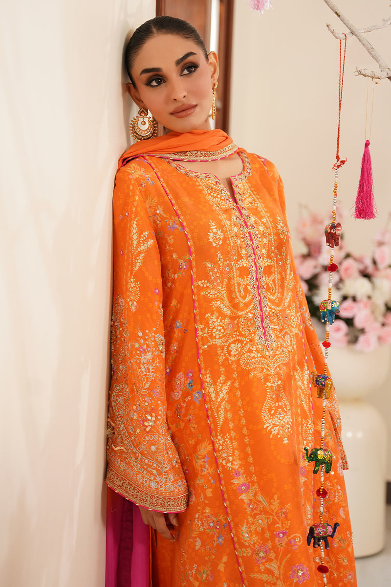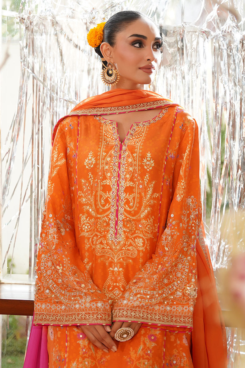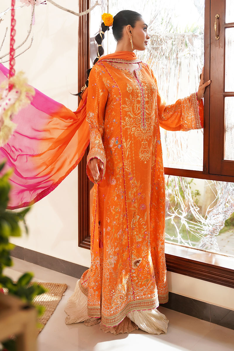 Embrace timeless elegance with this stunning mustard-orange kurta, beautifully adorned with delicate floral motifs in soft pinks and beige. The design is elevated with intricate hand embellishments of gota, dabka, and Swarovski crystals, adding just the right touch of shimmer and sophistication. A neat piping finish adds structure and finesse to the overall silhouette. Paired with a graceful two-tone dyed dupatta, featuring subtle color transitions and finished with elegant zari borders, this ensemble exudes understated luxury. A crushed dhaka is offered as an optional add-on, perfect for those who want to complete the look with a rich, textured bottom. Ideal for festive gatherings, intimate weddings, or celebratory events, this ensemble blends tradition and modern elegance effortlessly. Shirt maximum length: 54 Model height 5’5 Dhaka: Cotton Silk Shirt: Pure Raw Silk Dupatta: Tissue Silk
