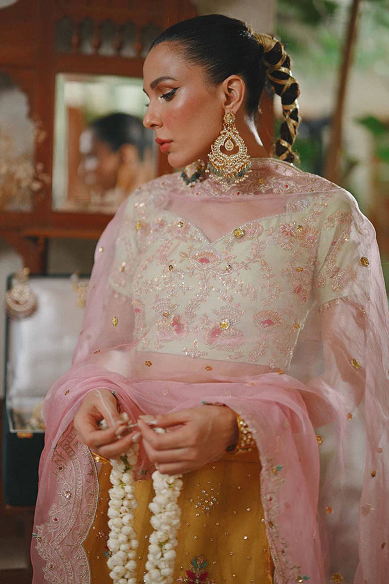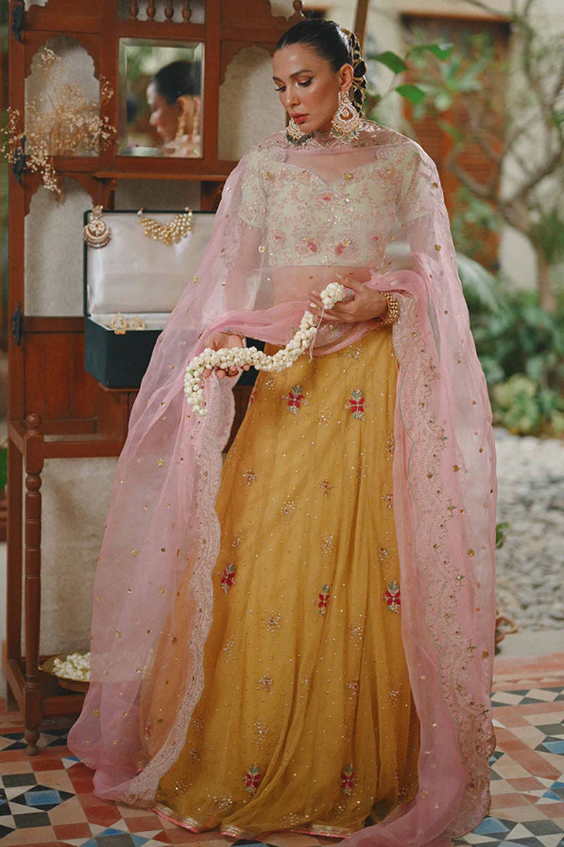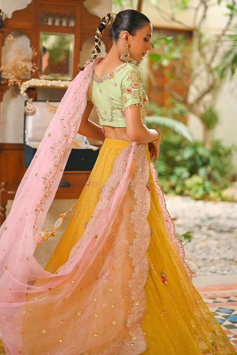 The apple green choli boasts antique kora dabka work, with a scalloped neckline and elegant half sleeves. Paired with a Tuscany mustard lehenga in the net, sprinkled with sequins, and adorned with intricate kora dabka resham bootis, it creates a harmonious blend of colors and textures. The ensemble is elevated further by the flamingo pink dupatta, featuring sequences, threadwork embroidery, and in-house zari borders. This striking color combination of apple green, Tuscany mustard, and flamingo pink is a true masterpiece, bringing together traditional and contemporary elements in a stunning and vibrant ensemble. Ohhh we love this colour play!!! The apple green choli boasts antique kora dabka work, with a scalloped neckline and elegant half sleeves. Paired with a Tuscany mustard lehnga in the net, sprinkled with sequins, and adorned with intricate kora dabka resham bootis, it creates a harmonious blend of colors and textures. The ensemble is elevated further by the flamingo pink dupatta, featuring sequences, threadwork embroidery, and in-house zari borders. This striking color combination of apple green, Tuscany mustard, and flamingo pink is a true masterpiece, bringing together traditional and contemporary elements in a stunning and vibrant ensemble. Lehenga: Organza Choli: Organza Dupatta: Silk