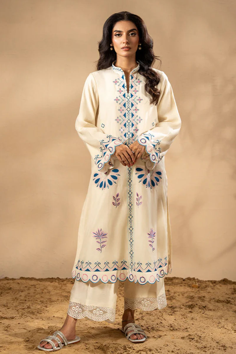 This white kora cotton shirt is a breath of fresh air in refined minimalism. Crafted from airy, lightweight fabric, it features delicate embroidery and subtle applique work in soft tones of blues and pinks, creating a serene yet sophisticated palette. the outfit is complete with pure raw silk pant with embroidered borders on the hem. The minimal detailing makes it an ideal choice for daytime gatherings, casual summer festivities, or elegant everyday wear. Pants are add onShirt maximum length 45Model height: 5'5