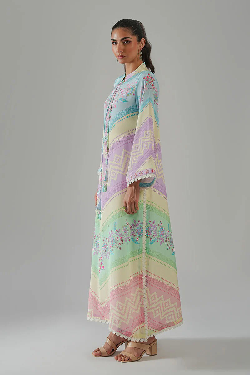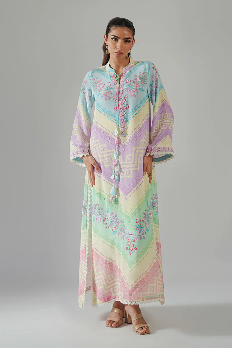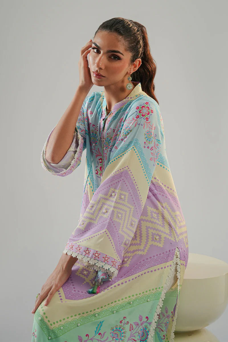This beautiful outfit features a printed crepe long-cut kurta, showcasing a soft, flowing silhouette that enhances both comfort and style. The kurta is adorned with pastel diagonal arrow patterns, arranged in a way that adds a modern, geometric flair to the traditional design. The subtle pastel hues—blush pink, lavender, and mint green—blend seamlessly, creating a fresh, airy vibe that's perfect for spring or summer. rawsilk pants are an add on. Model height 5'10. Maximum shirt length 56"