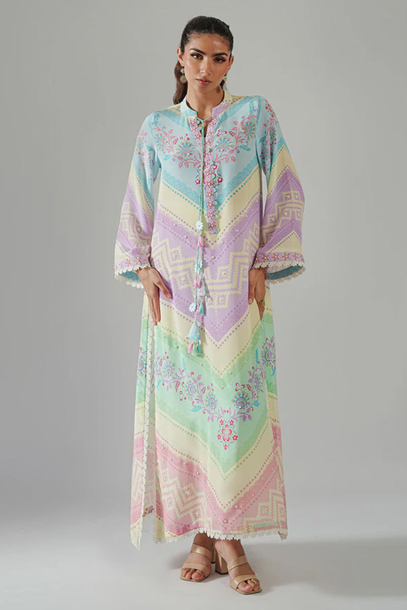 This beautiful outfit features a printed crepe long-cut kurta, showcasing a soft, flowing silhouette that enhances both comfort and style. The kurta is adorned with pastel diagonal arrow patterns, arranged in a way that adds a modern, geometric flair to the traditional design. The subtle pastel hues blush pink, lavender, and mint green blend seamlessly, creating a fresh, airy vibe that's perfect for spring or summer. rawsilk pants are an add on. Model height 5'10. Maximum shirt length 56" Shirt: Pure Crepe Pant: Pure Rawsilk