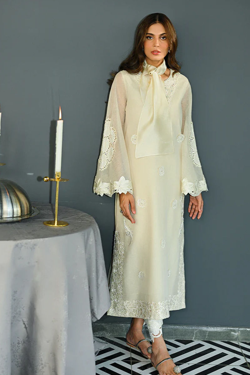 This exquisite ivory outfit is crafted from our signature in-house cotton organza, offering a delicate and ethereal look. The neckline is adorned with intricate hand embroidery, showcasing meticulous craftsmanship that adds a touch of elegance. The hemline is similarly detailed with fine, intricate embroidery, ensuring a graceful finish. The bell sleeves are a highlight, featuring delicate cutwork floral lace and embroidery, offering a soft, feminine charm. Paired with this ensemble is an organza dupatta, elegantly finished with cutwork lace that complements the outfit’s refined aesthetic. The pants complete the look, featuring a carefully embroidered motif, adding a subtle yet sophisticated detail to the overall design. This outfit exudes timeless grace, perfect for a luxurious, high-fashion look. Pant is an add on.Shirt maximum length 52Model height 5’11