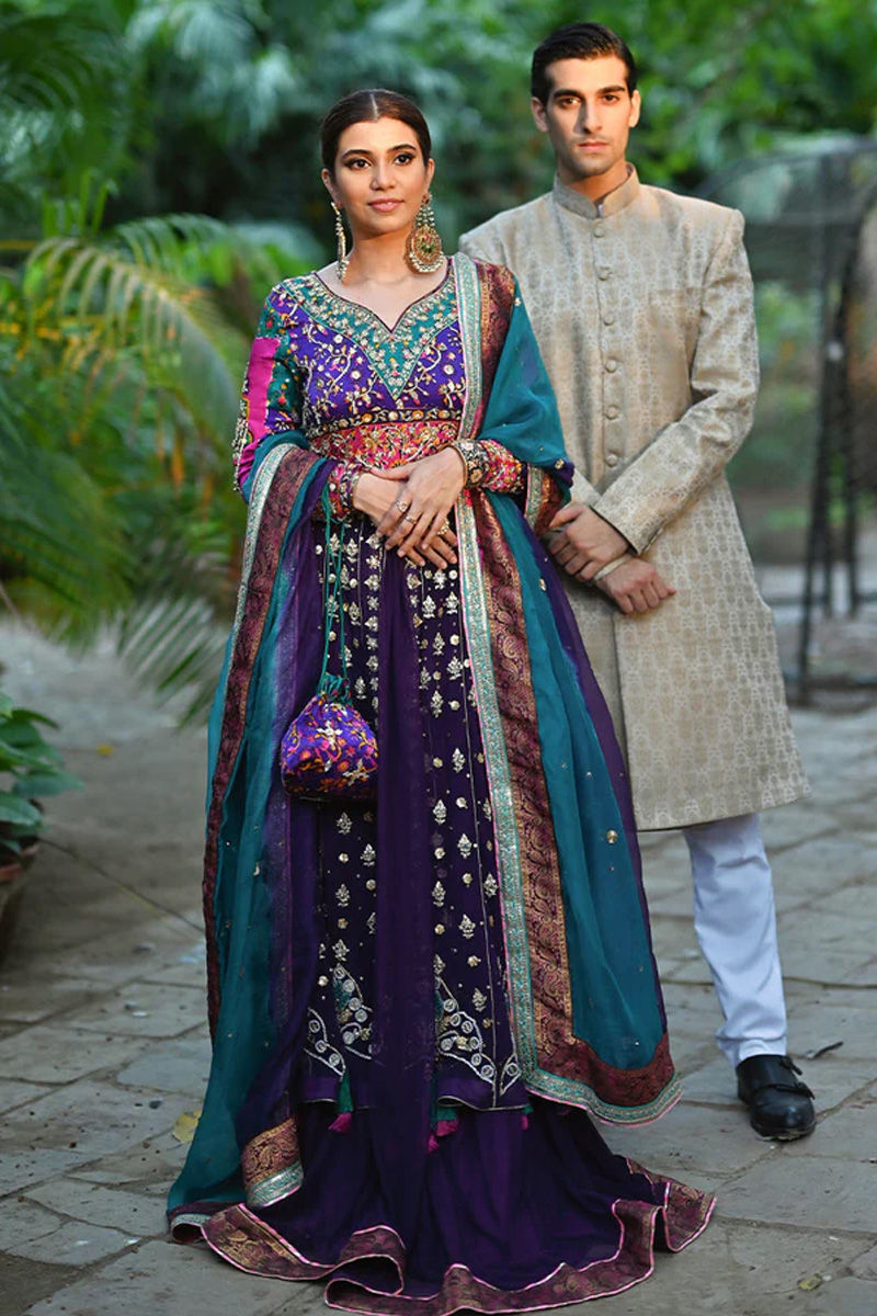One of our star outift of the Alishay collection is the Minna Kalidar. A burst of colours in hues of royal purple, teal and pinks with handprinted bodice fully laden with handwork in zardozi gotta kora dabka and intricate detailed hangings! We absolutely drool over the sleeves and back handworked cut out details. The neckline is a wide paan to make it easier for the bride or brides-maid to pair the minna kalidar with chunky neck piece or choker. The kalidar is in net making it body flattering and festive. Kalidar is fully encrusted with handwork booties scallops on the front open and gota! We absolutely love the Daman scalloped border on the front and back with handwork, French knots and in house Resham hanging tassels in hues of pink. And teal. The lengha is also of net in royal purple with banarasi finishing’s. Our love for details is never ending we have placed fully handworked chaandbali motif on front open. The lengha is in net with banarasi border and teal border finishing’s. The Duppata is two toned in pure oraganza with chan and 4 sided finishing’s! Add the potli pouch. Lehenga: Net Shirt: Net Dupatta: Net