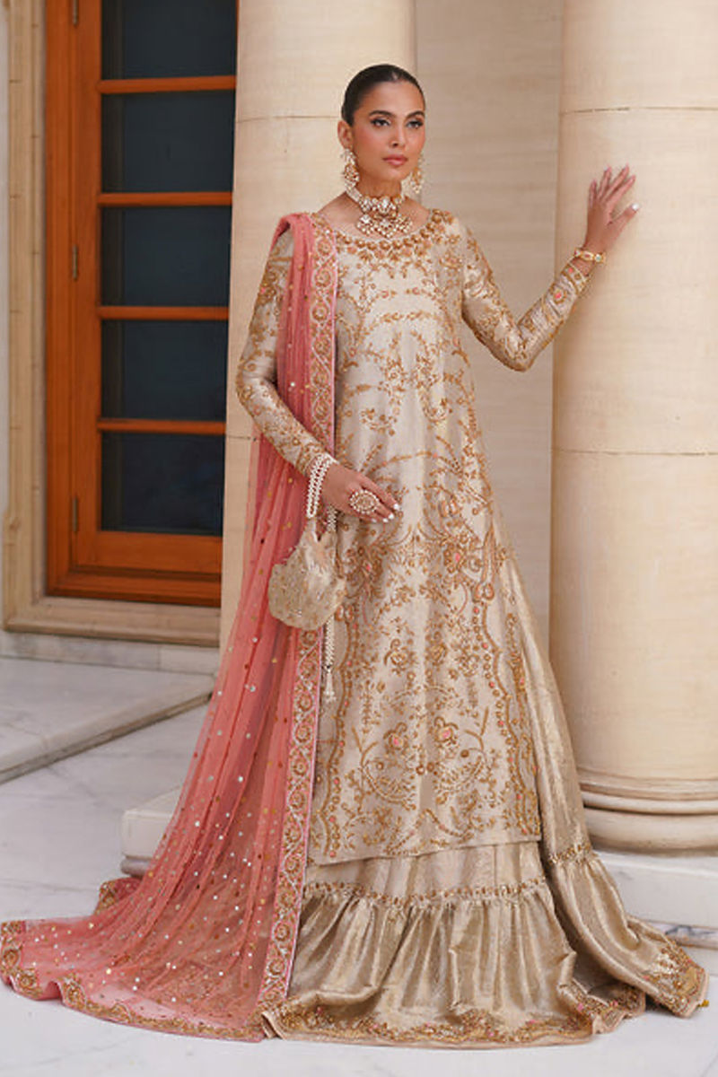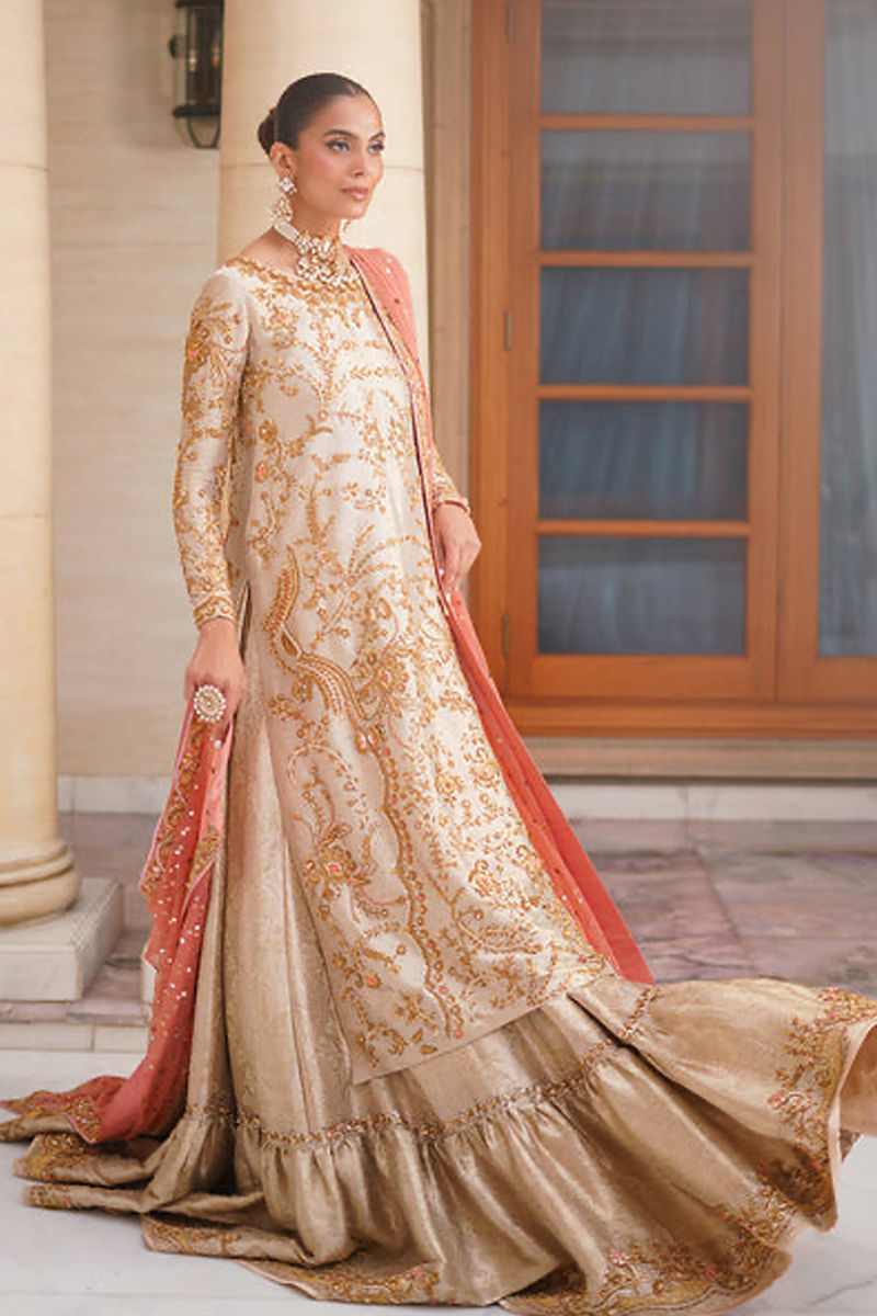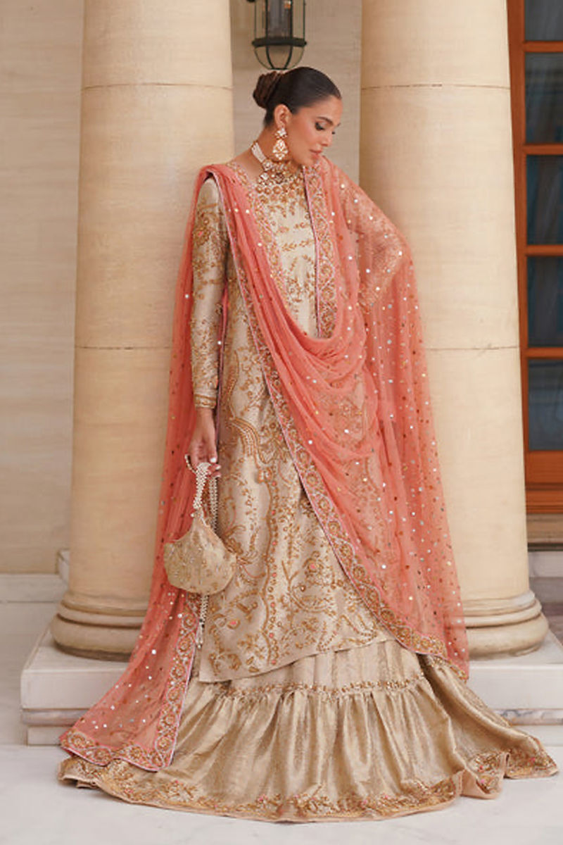 A statement of timeless elegance, this gold bridal ensemble is exquisitely crafted with a pure lama silk shirt and a regal pure atlas jamawar lehenga, paired with a contrasting coral net dupatta that adds a striking pop of color. The design is adorned with intricate antique gold dabka, Swarovski stones, sitara, and delicate resham accents, creating a luminous harmony of textures. The modern layout of embellishment is thoughtfully balanced with traditional craftsmanship, making it both contemporary and classic. Completing the look, a hand-embellished pouch adds the perfect finishing touch, enhancing its bridal grandeur.