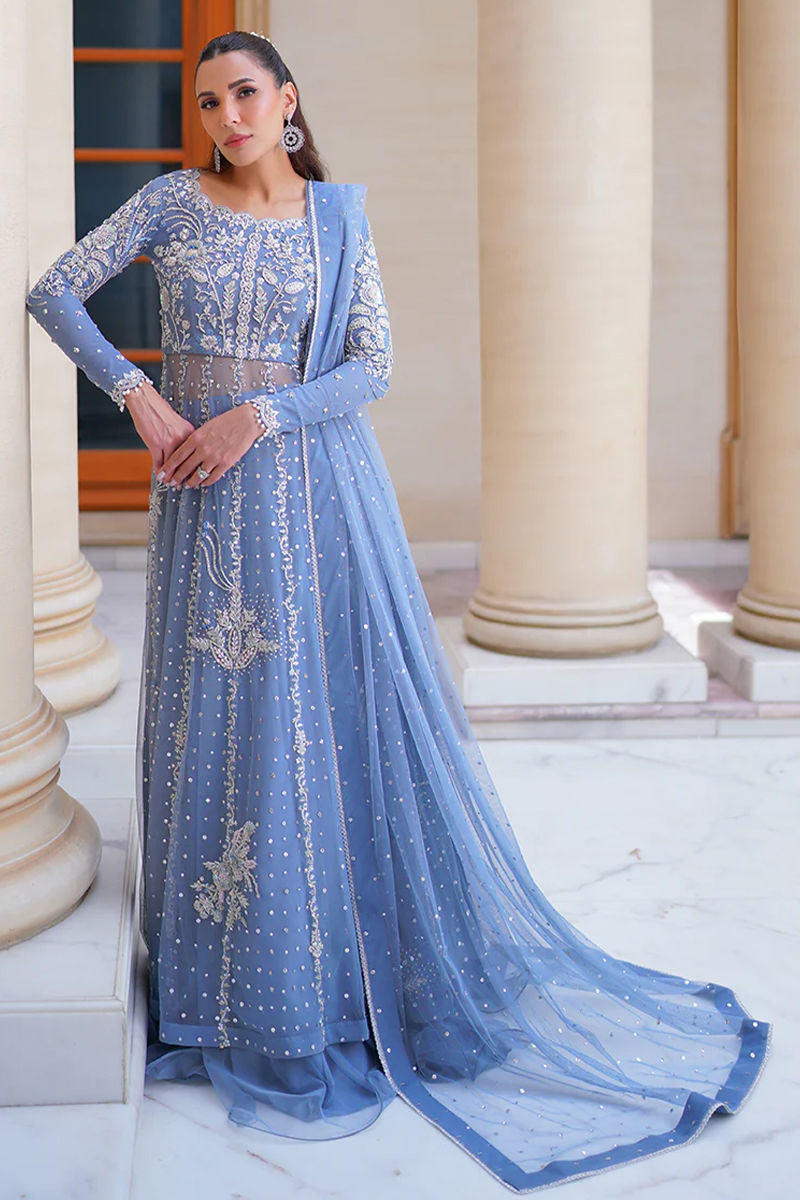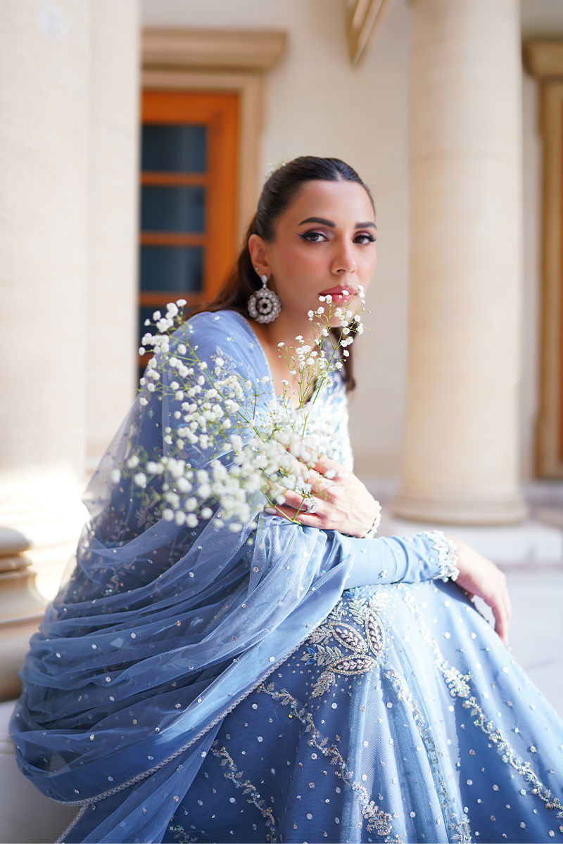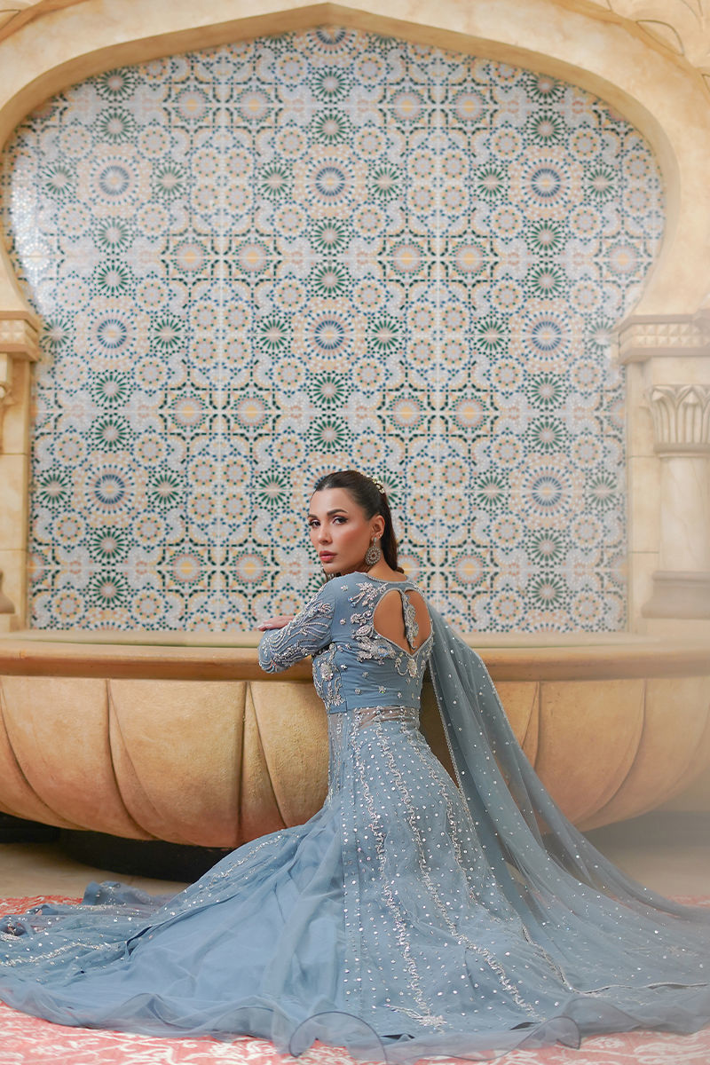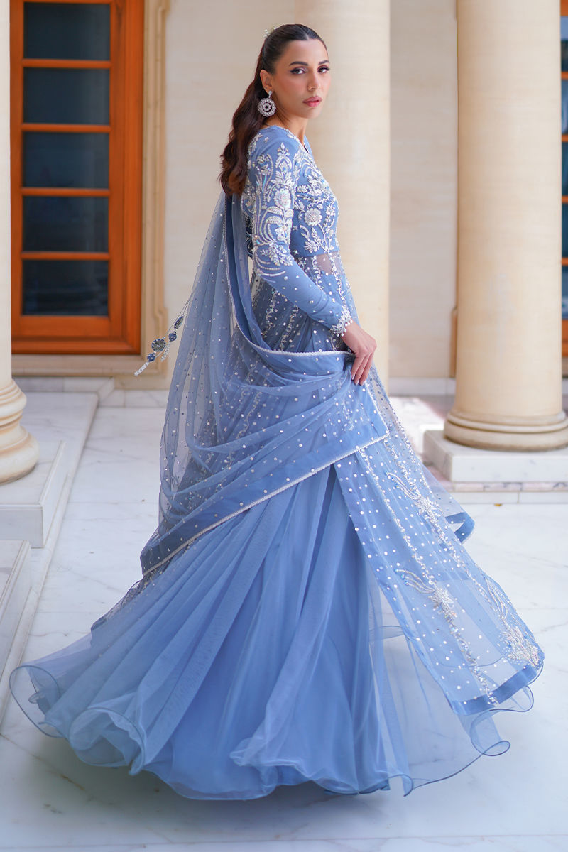 A statement of contemporary elegance, this blue net peshwas is paired with a voluminous lehenga and dupatta, designed to exude modern charm. The peshwas is exquisitely embellished with contemporary motifs and silver handwork of resham, Swarovski crystals, dabka, and kora, creating a luminous yet refined sparkle. The net dupatta, detailed with delicate chan all over, adds a soft, graceful allure. The lehenga is finished with a fish-wiring technique, enhancing its structure and adding dramatic volume for that perfect bridal oomph. Lehenga: Net Shirt: Net Dupatta: Net