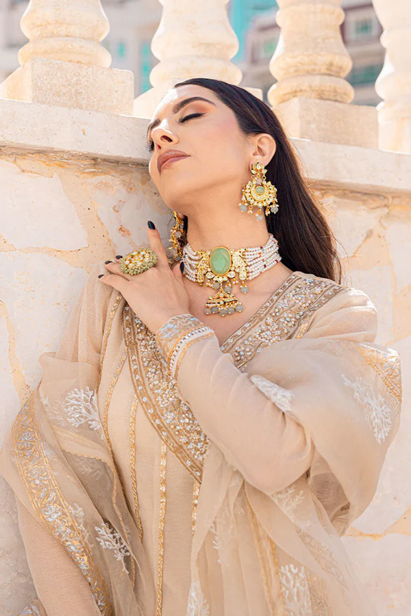 A biscuit beige angarkha style kalidaar on cotton organza is as traditional yet elegant as it gets with block print on neckline with hand embellishments and Blockprint on hem. The kalidar is Finished with Gota on kalis and lace details on sleeves. Dupatta is on organza with a full block print and laces on four sides pants are plain on imported silk. Pair it up with statement jewellery to be all set for the upcoming Ramadan and Eid seasons. A PERFECT FLOWY OUTFIT FOR THE BEAUTIFUL YOU. DRESS IT UP 0R DOWN WITH SMALL PEARLS OR POLKI JHUMKASShirt: Plain SilkDupatta: Plain Silk
