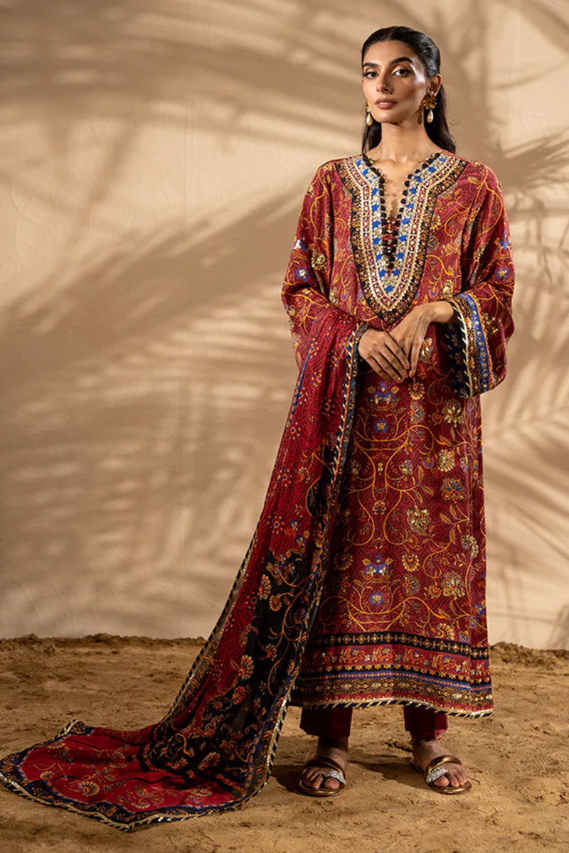 Rich, radiant, and rooted in tradition — this maroon printed pure crepe ensemble is a striking ode to timeless elegance. The fluid crepe fabric drapes beautifully, while intricate gotta and dabka handwork adds a touch of festive shimmer, highlighting the artisanal craftsmanship. The ensemble is paired with a printed dupatta that carries a harmonious blend of motifs and colors, offering a refined contrast that enhances the overall look. Perfect for celebratory occasions, this outfit blends heritage detailing with effortless grace. Pants are add on.Shirt maximum length 48Model height: 5’5