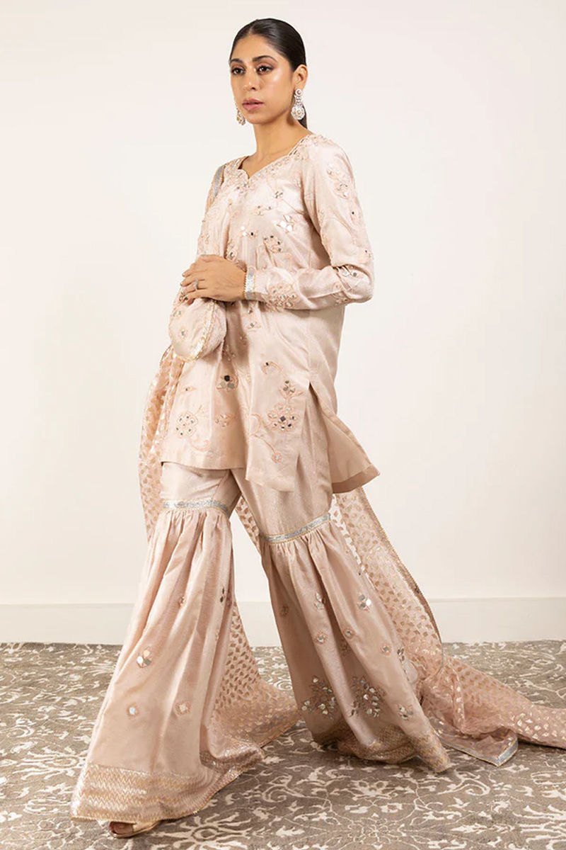 In a beautiful tone of blush pink on self jamawar we have created a state of the art festive fully mirror and resham worked ensemble! Age-old gharara for the 'Desi Girl' in you, designed specially keeping the latest trends in mind. A flattering neckline with fully embroidered jaal on shirt front and sleeves. A statement back with signature mirror tassels and fully worked gharara is enough to turn heads around. We have finished it with sparkly organza duppata beautifully worked with gotta. To make it more festive we have designed a potli pouch that you can pair along with it. Style it up with dangling silver earrings with statement heels or your gotta flower jewellery with chapels . IT CAN BE Customized IN TONES OF IVORY MINT LIGHT BLUE AND LIGHT YELLOWShirt: Self JamawarDupatta: Organza
