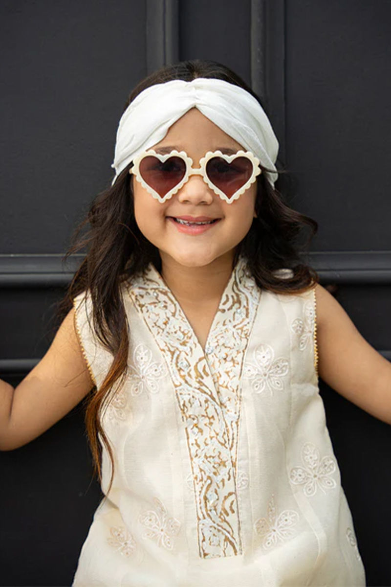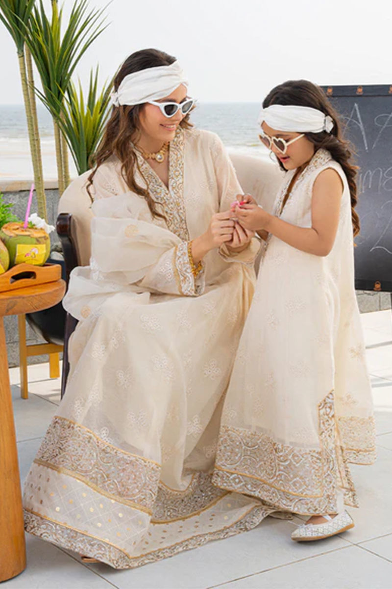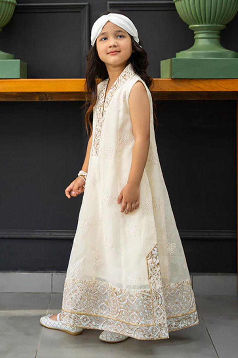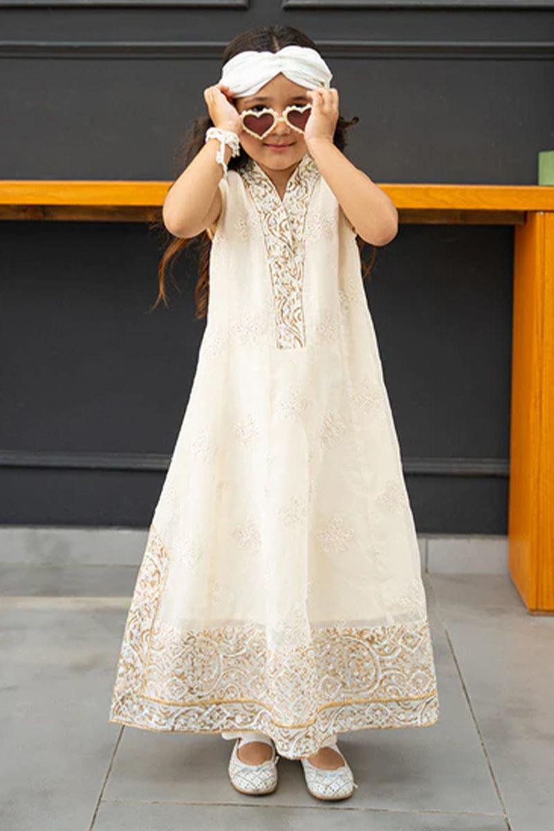 adorable block kalidar cut shirt on cotton organza shirt with minimal hand work, enhanced with gota laces. Style it up with cute bows , bandanas and shades making it a perfect eid outfit pants are on silkShirt: Cotton OrganzaPant: Cotton Organza