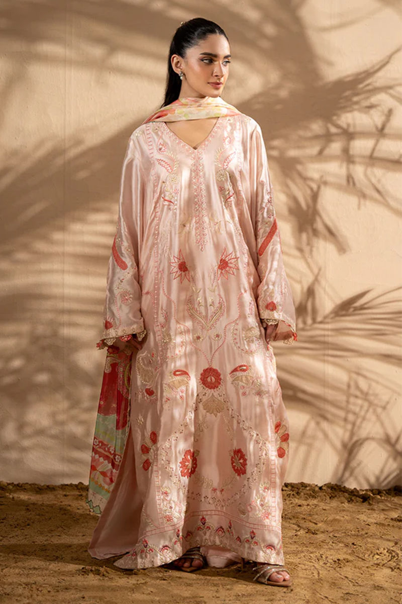 Blush pink never looked this effortlessly luxe — this sheesha silk shirt is a soft statement in elegance, adorned with intricate embroidery and elevated by subtle appliqué in contrasting tones that add depth and dimension. The sleeves feature delicate embroidery detailing, bringing an extra layer of refinement to the overall look. Paired with matching sheesha silk culottes for a seamless, sophisticated silhouette, the outfit is beautifully completed with a contrasting printed silk dupatta that introduces a touch of vibrant charm. Perfect for daytime festivities or elegant summer soirées, this ensemble blends grace with contemporary flair. Dupatta is an add on.Shirt maximum length 52Model height 5’2