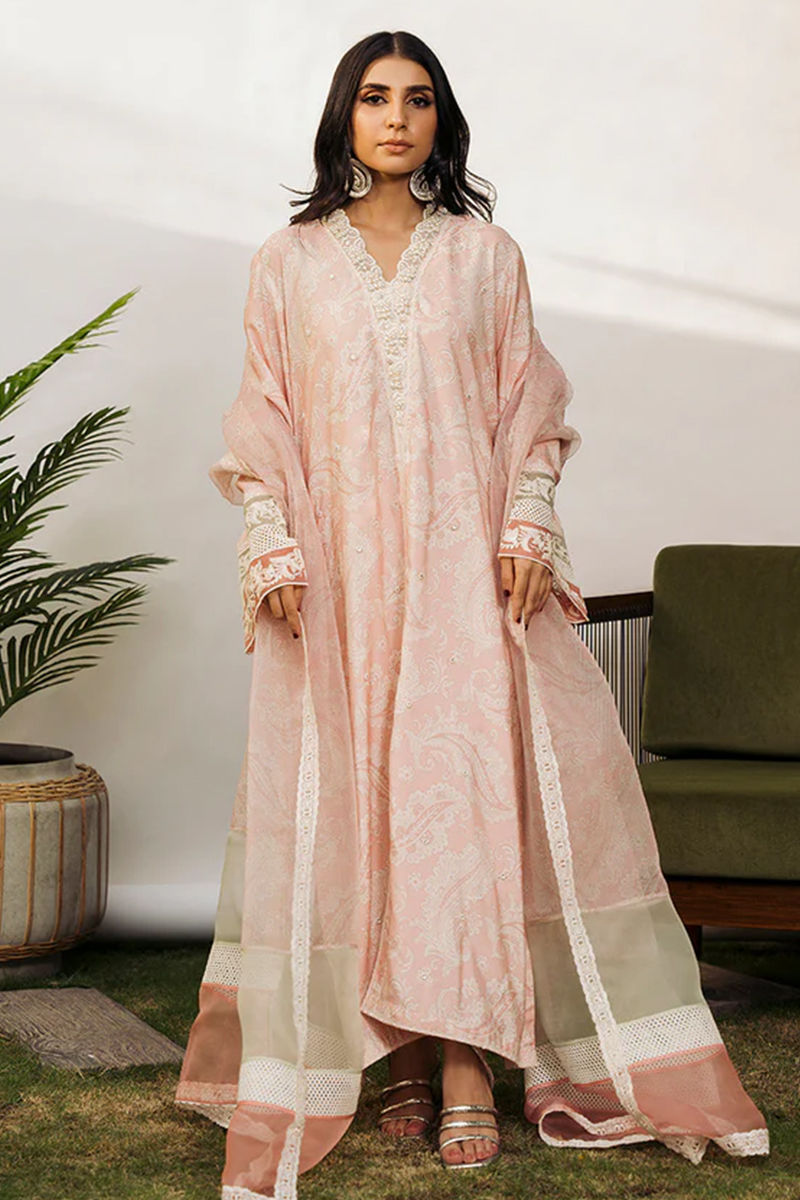 Oh so pretty powder pink khaddi silk printed shirt with wide daaman is a plethora of various techniques using multiple laces, embroidery, stones and pearls. Organza printed dupatta is Uber cool with mint and pink organza or pallus and finished off with lace. Stunner at its best….a wardrobe staple for sure! Pure Rawsilk Pants comes as Add On.
