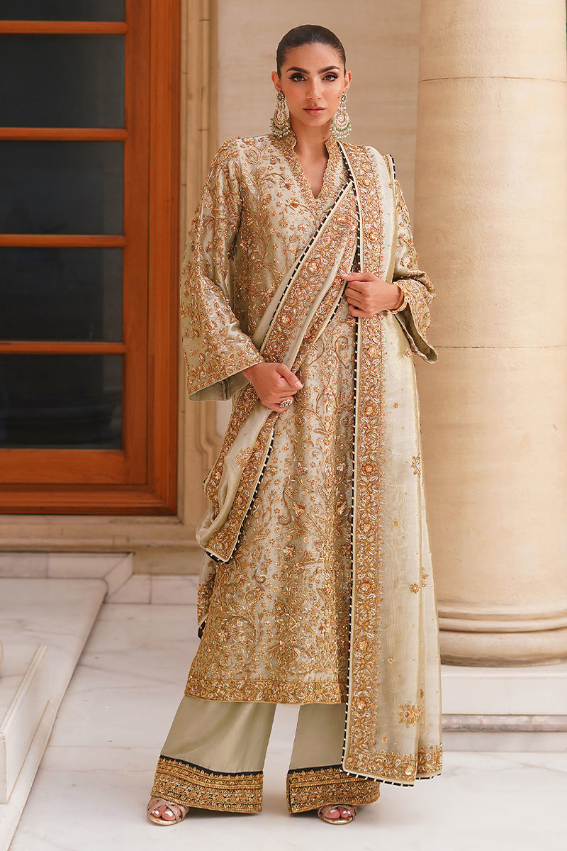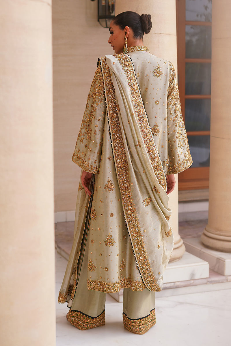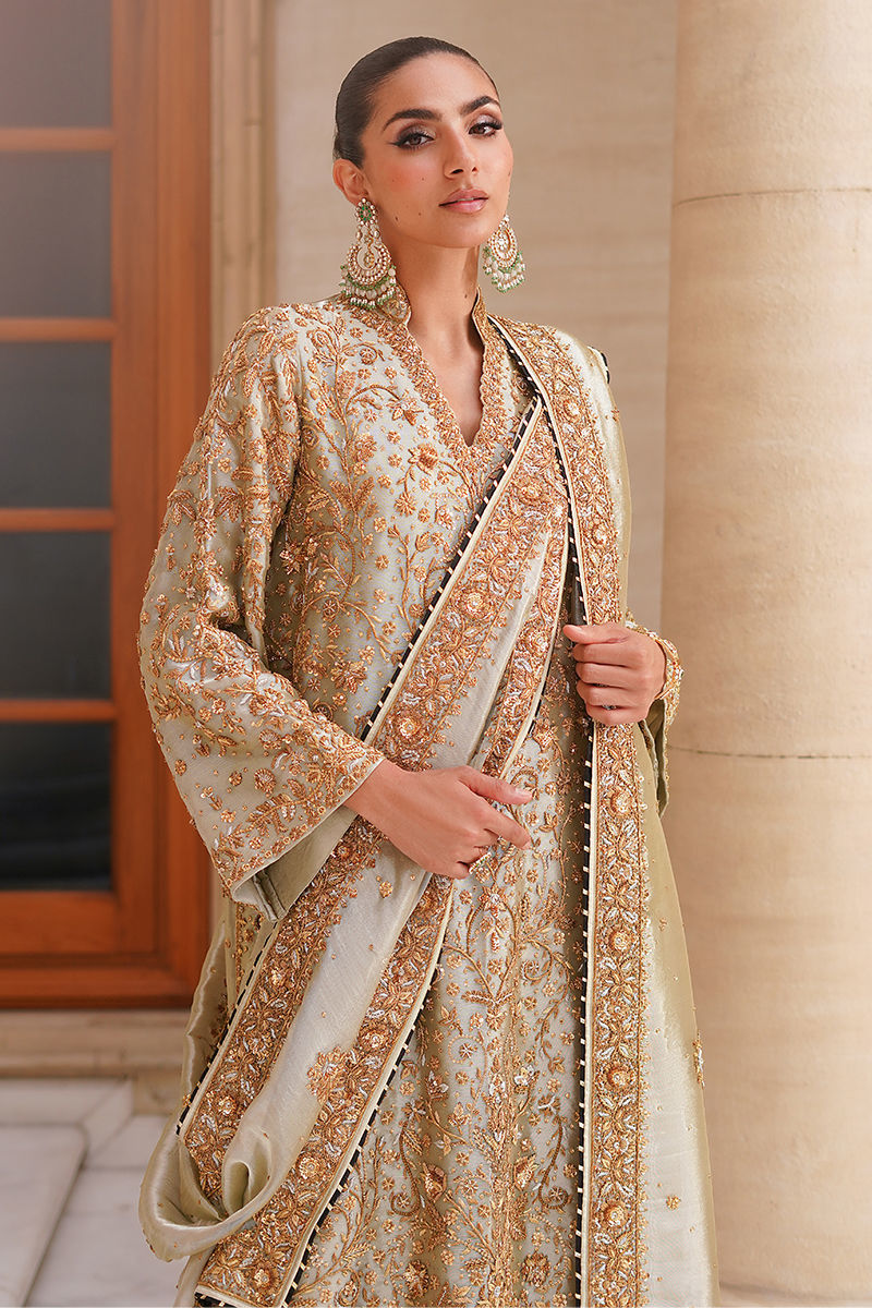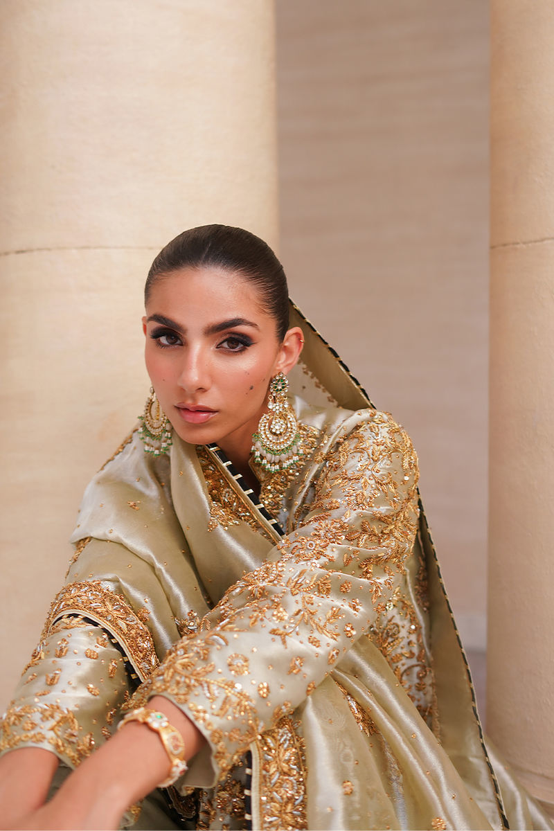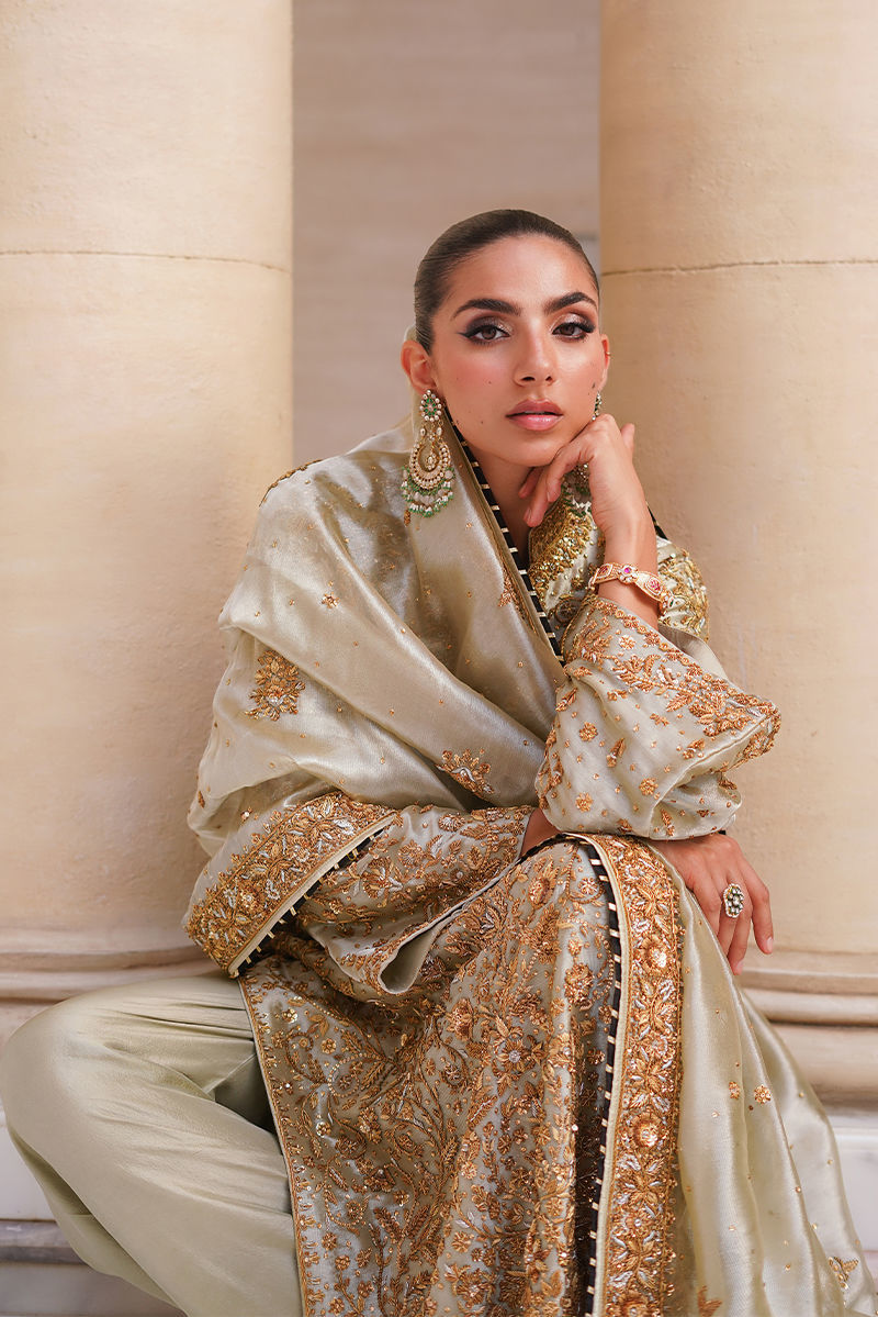 An elegant statement piece, this sage green tissue shirt is styled in a straight long cut, fully adorned with intricate hand embroidery in antique gold and silver tones featuring dabka, kora, and sitara for a timeless shimmer. It is paired with hand-worked izaar pants, finished with appliqued borders and a subtle hint of black, adding depth and sophistication. Completing the ensemble, the dupatta is detailed with hand-worked borders and sleek black piping, lending a regal touch to the overall look. Shirt: Tissue Dupatta: Tissue Izaar: Pure Raw Silk