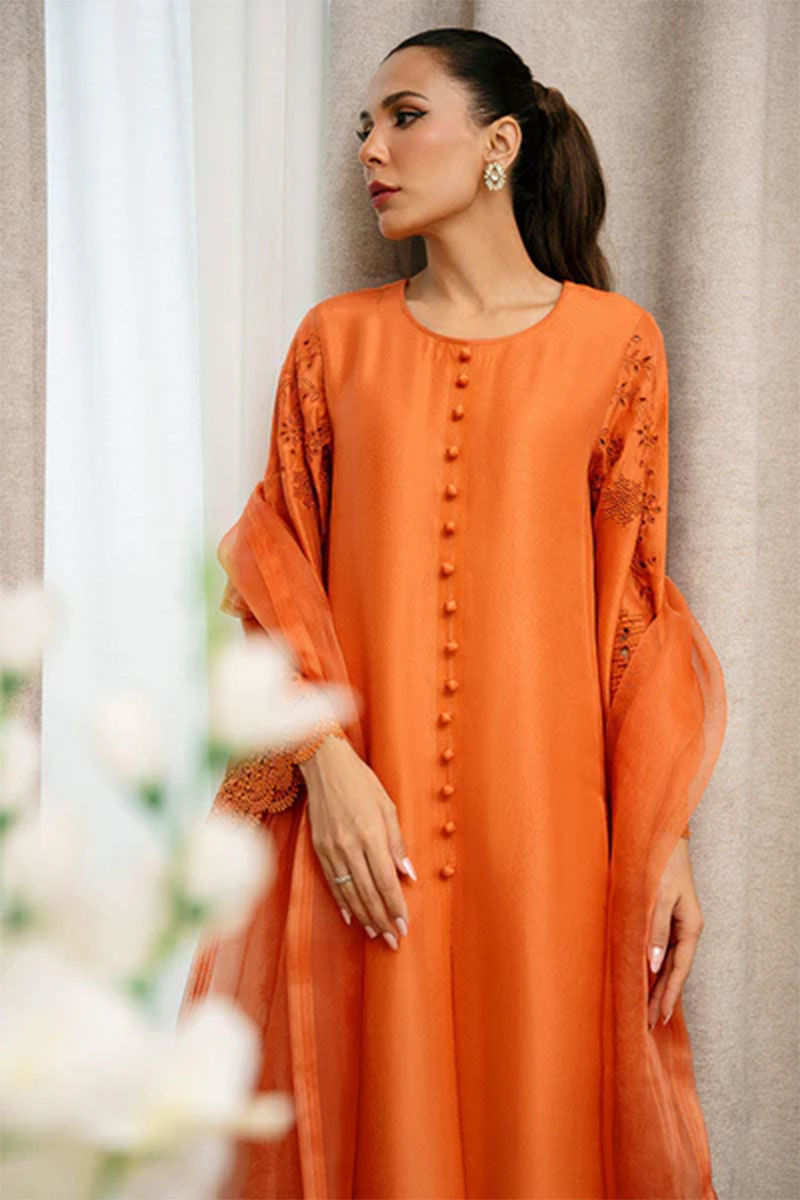 The silk tangerine shirt features cutwork sleeves and a sleek cut, adorned with fabric buttons and lace details on the side slits and daaman. Style it up or down for summer brunches or intimate dholkis. The outfit is completed with an organza dupatta finished off with laces and silk pants, creating a stylish and elegant ensemble.Shirt: Raw SilkDupatta: Raw Silk