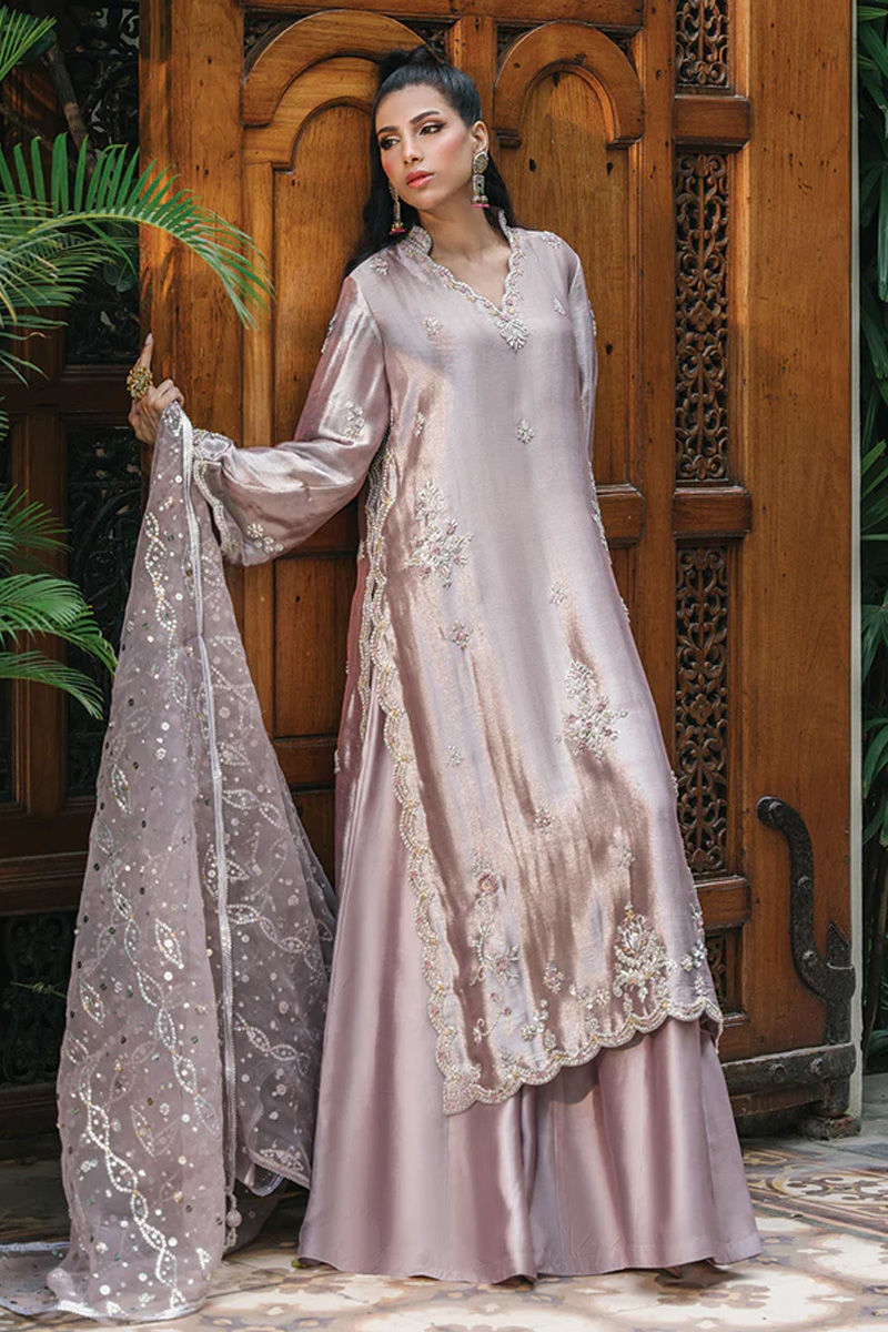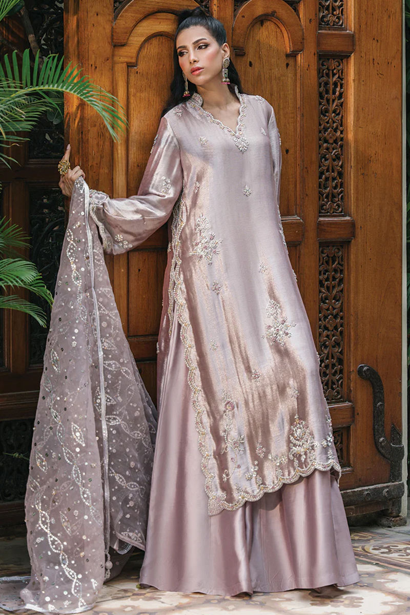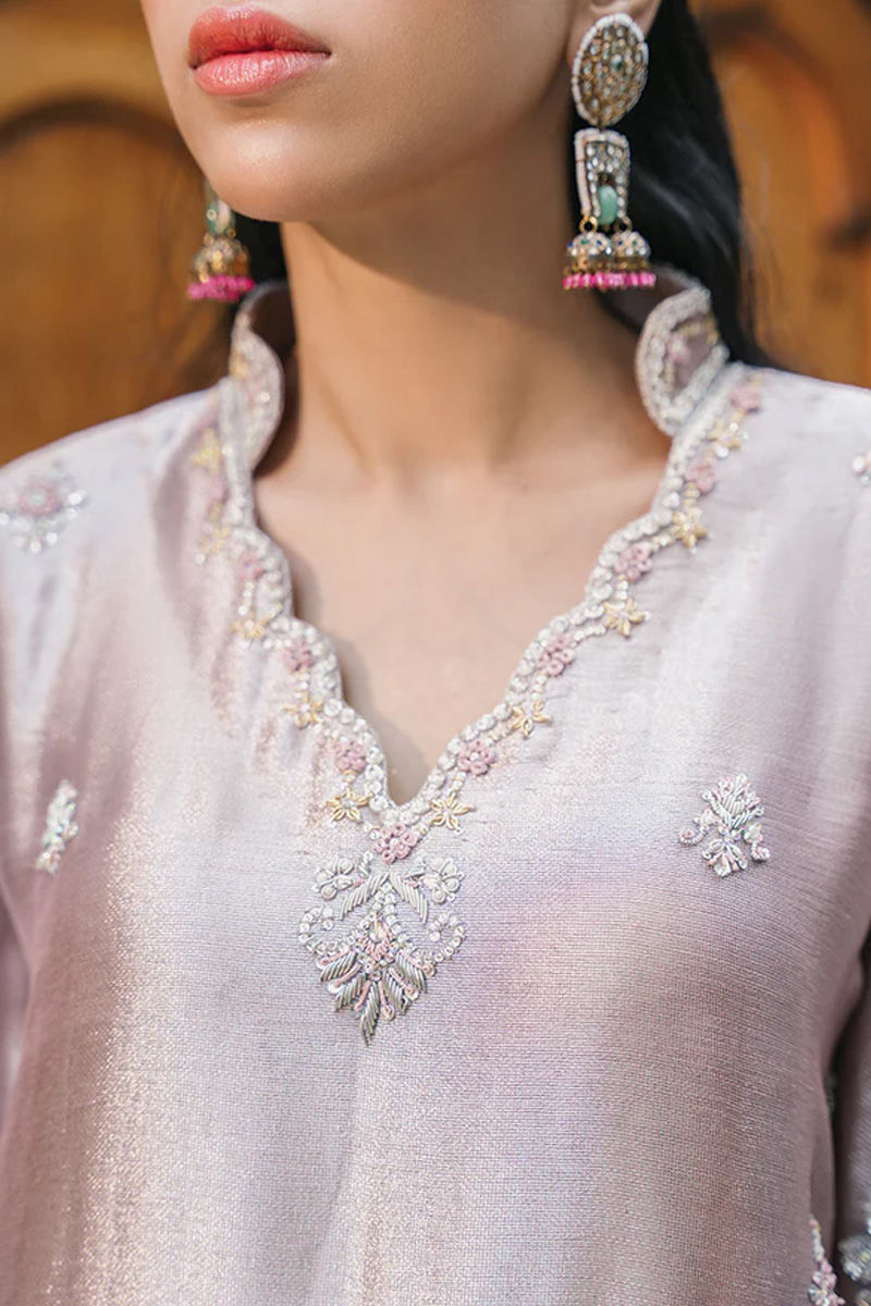 Nilufer: This lilac monochrome formal outfit features a shirt crafted from delicate zari net fabric, known for its shimmering texture and elegant drape. The shirt is designed with scalloped edging, which adds a sophisticated touch of intricate detail along the hems. The neckline is a contemporary masterpiece, adorned with hand aari and zardozi that blends modern design elements with traditional artistry. The embroidered collar adds a refined edge to the shirt, enhancing its chic and polished look. The dhaka, made from luxurious sheesha silk, is a standout element of this ensemble. The dupatta is crafted from airy organza, Adorned with handwork featuring sitara and crystals, the dupatta adds a touch of sparkle and sophistication. Styling tip: Choose understated, yet elegant jewelry to complement the monochromatic lilac theme. Dhaka: Sheesha silk Shirt: Zari net Dupatta: Organza