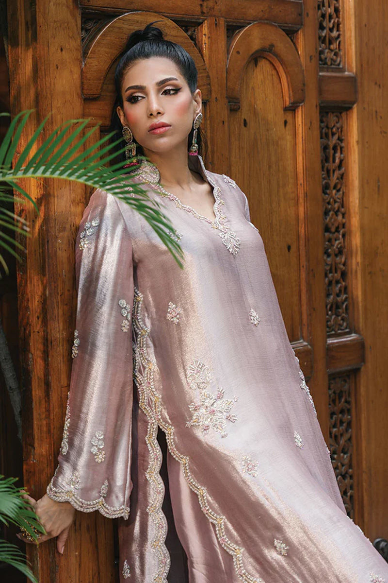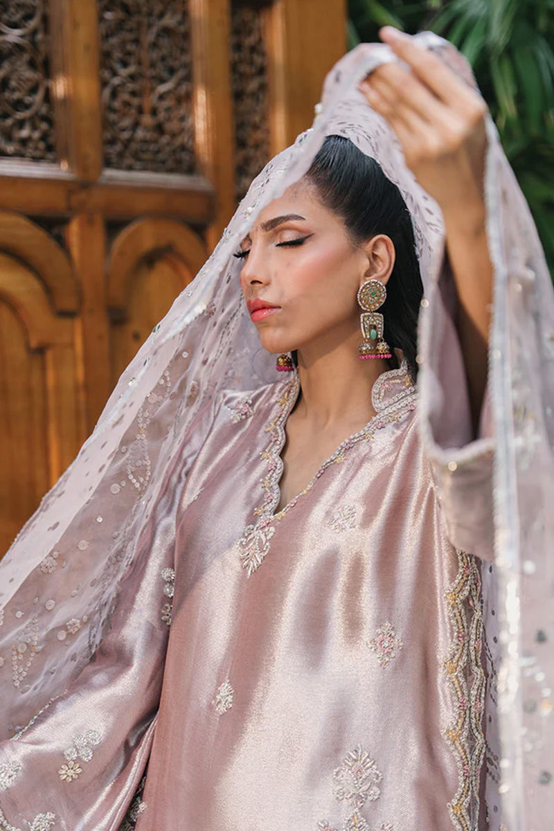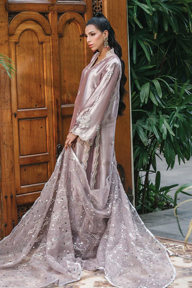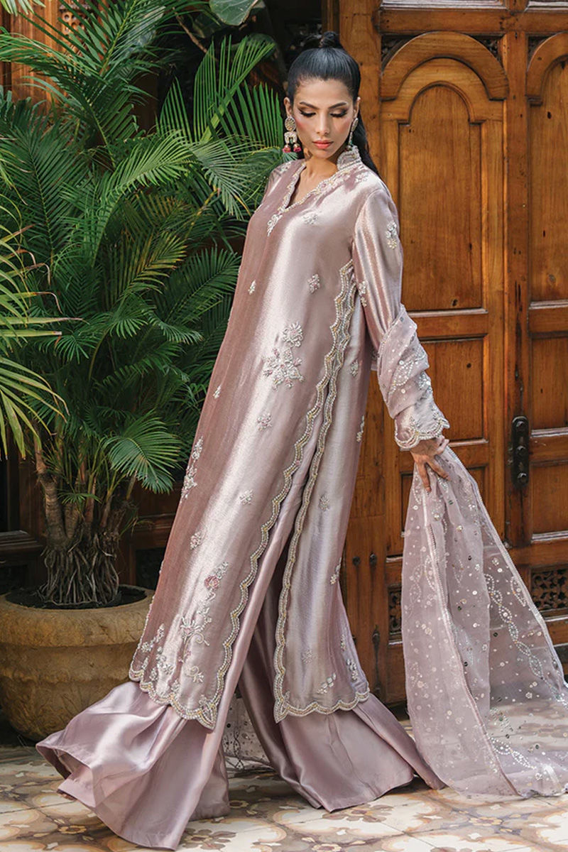 Nilufer: This lilac monochrome formal outfit features a shirt crafted from delicate zari net fabric, known for its shimmering texture and elegant drape. The shirt is designed with scalloped edging, which adds a sophisticated touch of intricate detail along the hems. The neckline is a contemporary masterpiece, adorned with hand aari and zardozi that blends modern design elements with traditional artistry. The embroidered collar adds a refined edge to the shirt, enhancing its chic and polished look. The dhaka, made from luxurious sheesha silk, is a standout element of this ensemble. The dupatta is crafted from airy organza, Adorned with handwork featuring sitara and crystals, the dupatta adds a touch of sparkle and sophistication. Styling tip: Choose understated, yet elegant jewelry to complement the monochromatic lilac theme. Dhaka: Sheesha silk Shirt: Zari net Dupatta: Organza