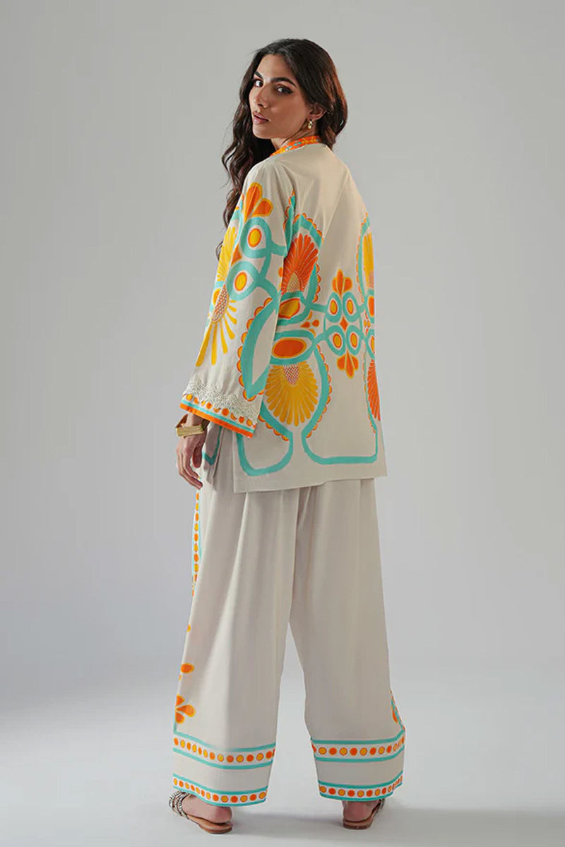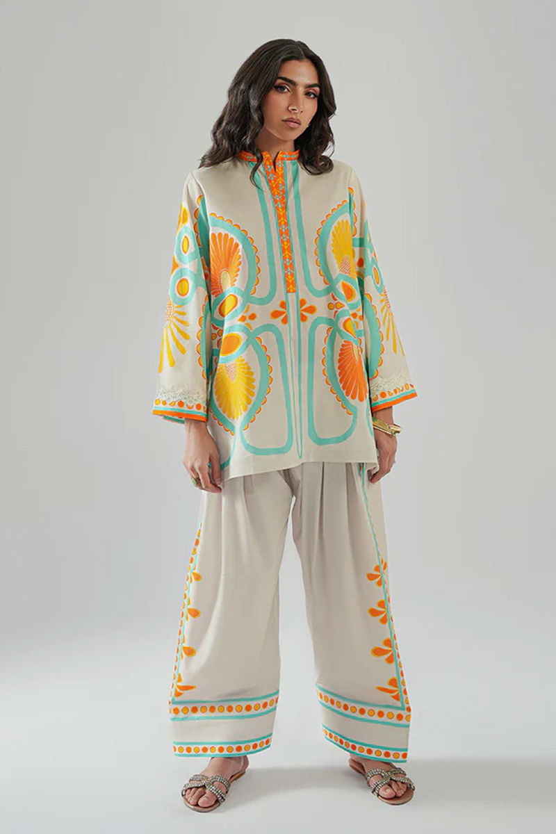 Relaxed fit is back in the game! This delightful outfit features a lawn ivory short shirt and shalwar set, adorned with a vibrant print that incorporates bold orange, feroze (turquoise), and yellow patterns. The ivory base of the shirt offers a soft, neutral backdrop, allowing the striking patterns in orange, feroze, and yellow to truly stand out. This lawn ivory printed short shirt and shalwar set, with its vibrant and cheerful colors, is perfect for casual gatherings, outdoor events, or festive occasions, offering a fresh, laid back and playful look.Model height 5'10, maximum shirt length 30".
