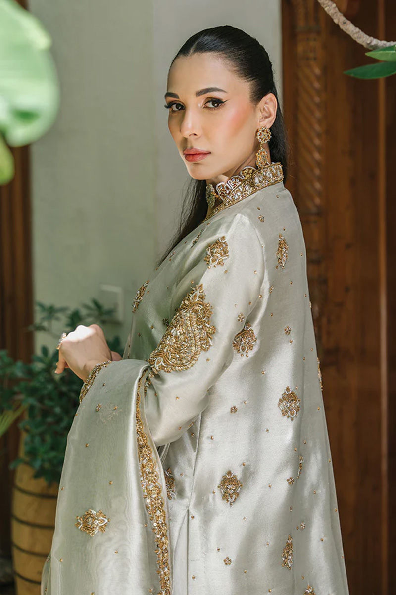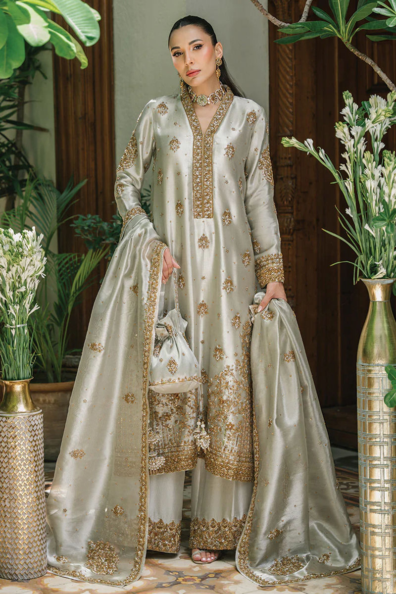 Nurelli: This silver-grey tone formal outfit exudes elegance and sophistication, featuring a shirt and dupatta crafted from luxurious tissue fabric. The shirt is a vision of opulence, meticulously embellished with rich handwork techniques. The detailed embroidery includes an array of dabka, crystals, and sitara, creating a dazzling effect that catches the light with every movement. The izhaar pants are crafted from pure raw silk, providing a luxurious contrast to the tissue fabric of the shirt and dupatta. The pants feature heavy hand-worked borders on the hem, showcasing exquisite embroidery that mirrors the opulence of the shirt. To complete the outfit, a hand-worked potli bag is an add on, designed to reflect the same intricate detailing as the shirt and dupatta. Styling tip: Opt for classic, statement jewelry that complements the rich handwork of the outfit. Style your hair in a sleek, sophisticated updo or soft, polished waves. Shirt: Tissue Dupatta: Tissue Pant: Pure raw silk Izaar: Pure raw silk