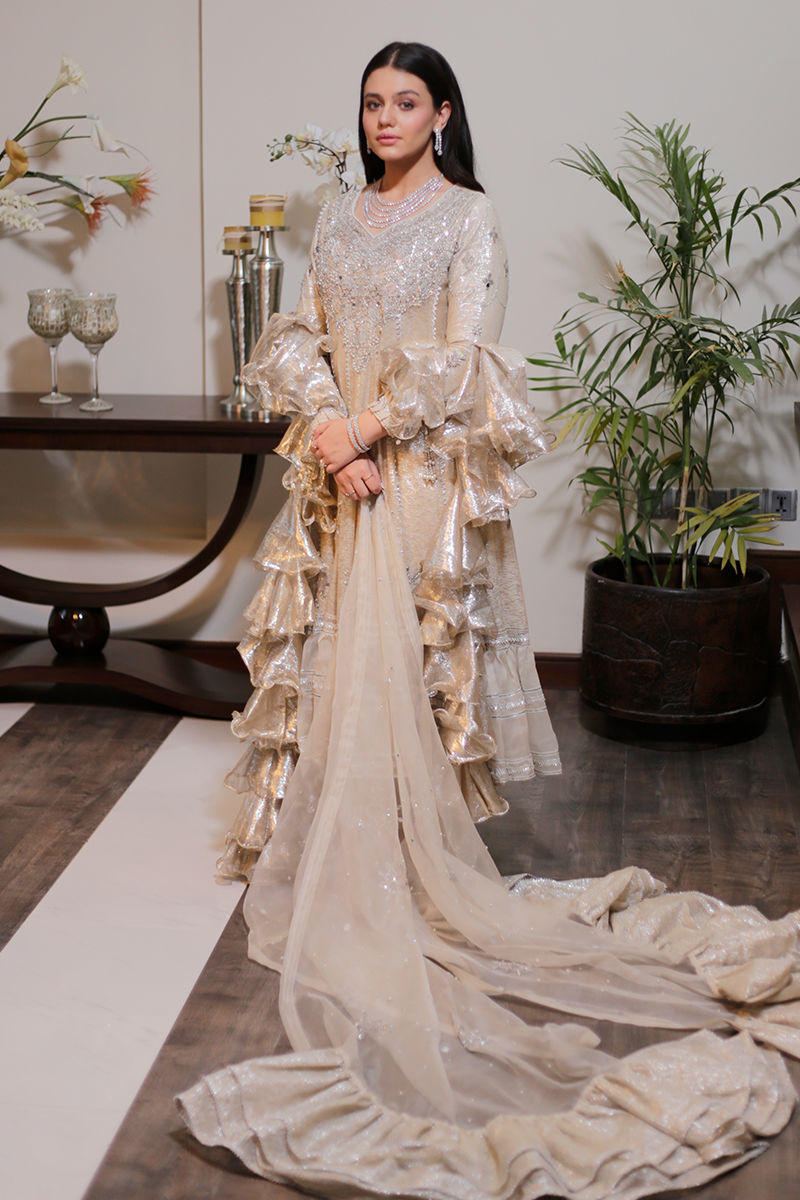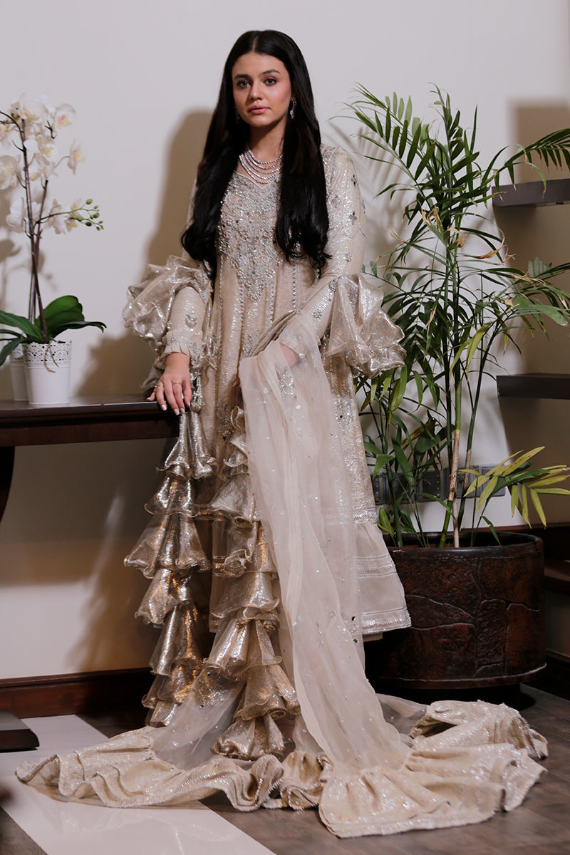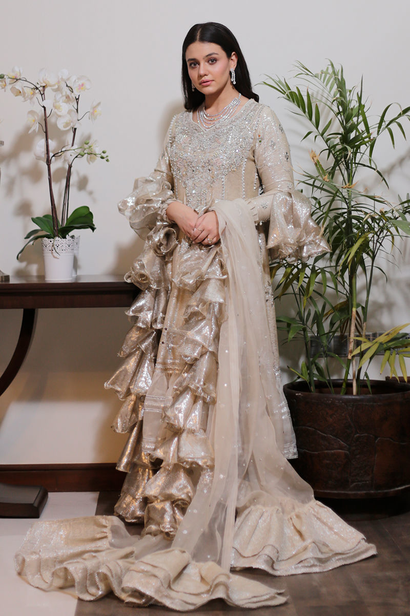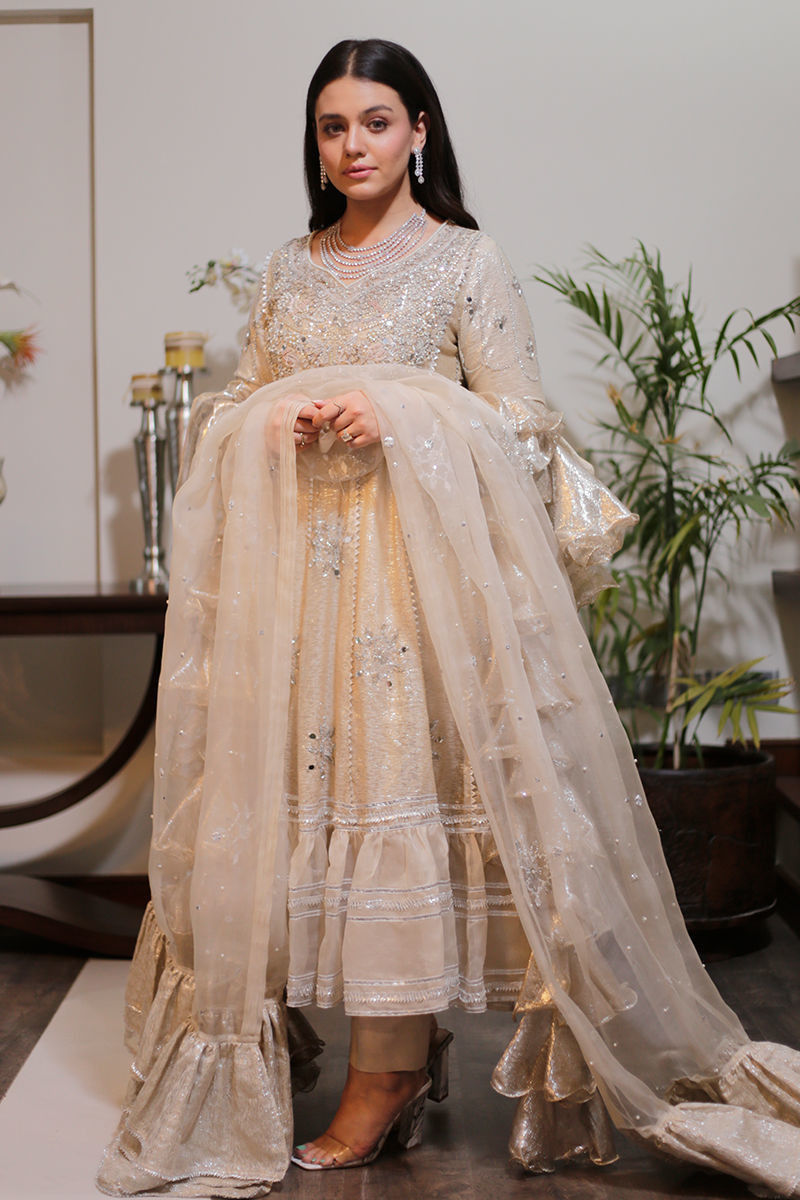 An absolutely dreamy shimmery Ivory kalidar with loaded with handwork and French knot detailing. The back detailing with chunky handwork tassels gives makes this outfit perfect for a bride or bridesmaid. The dupatta is laden with sequins spray and handwork floral motifs and seafoam exaggerated frills to make it enough to turn heads around. Shirt: Shimmer Dupatta: Shimmer Pant: Shimmer