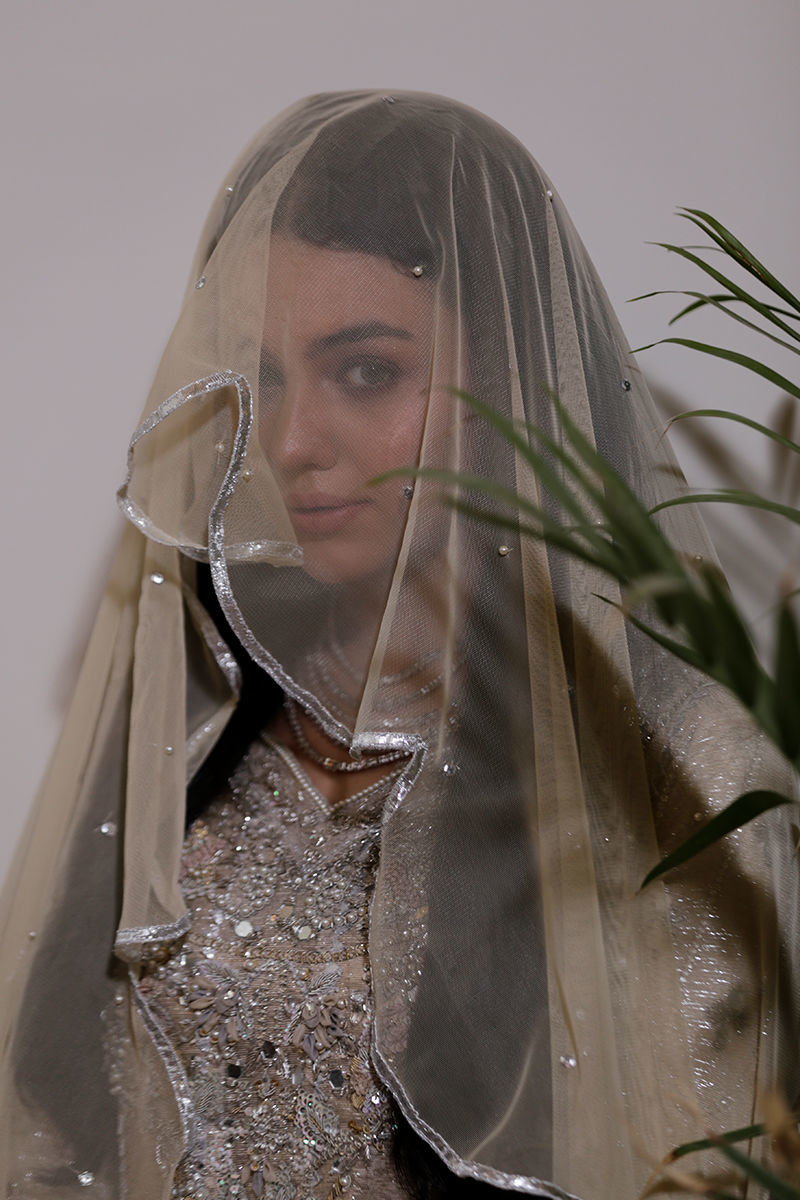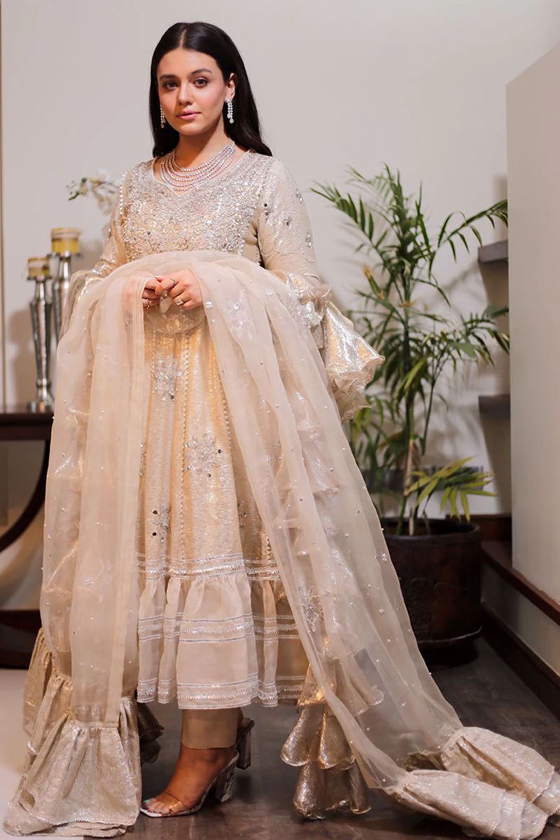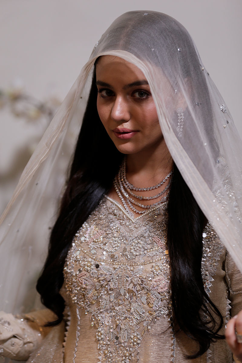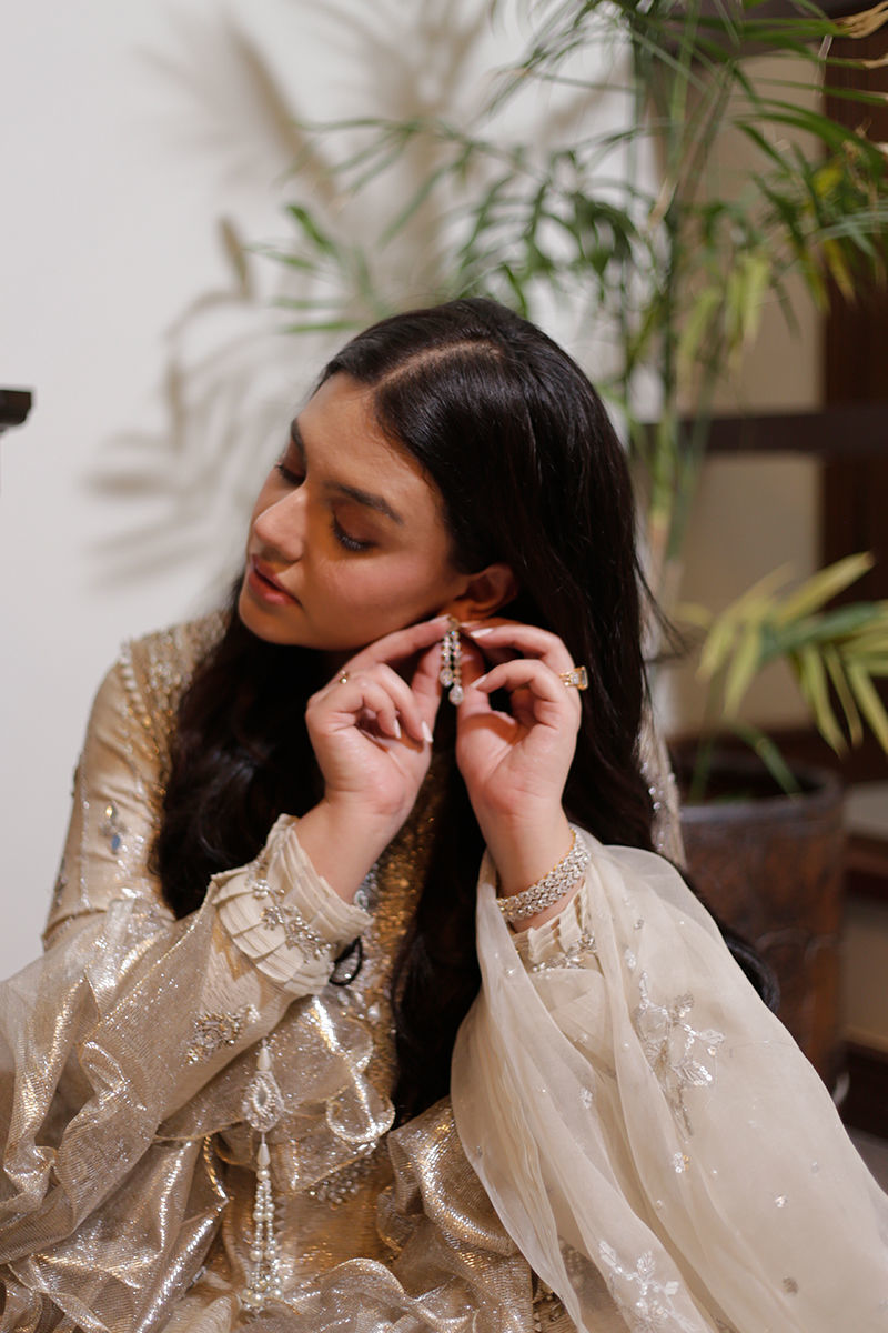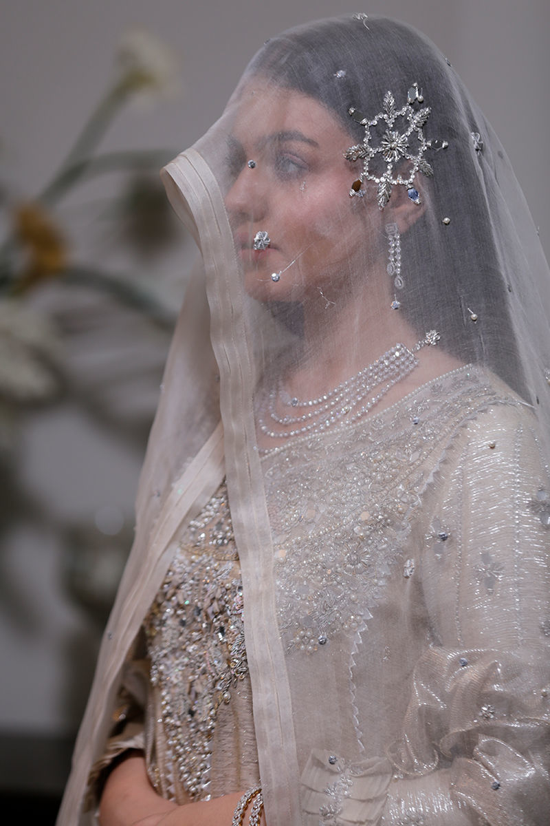 An absolutely dreamy shimmery Ivory kalidar with loaded with handwork and French knot detailing. The back detailing with chunky handwork tassels gives makes this outfit perfect for a bride or bridesmaid. The dupatta is laden with sequins spray and handwork floral motifs and seafoam exaggerated frills to make it enough to turn heads around. Shirt: Shimmer Dupatta: Shimmer Pant: Shimmer