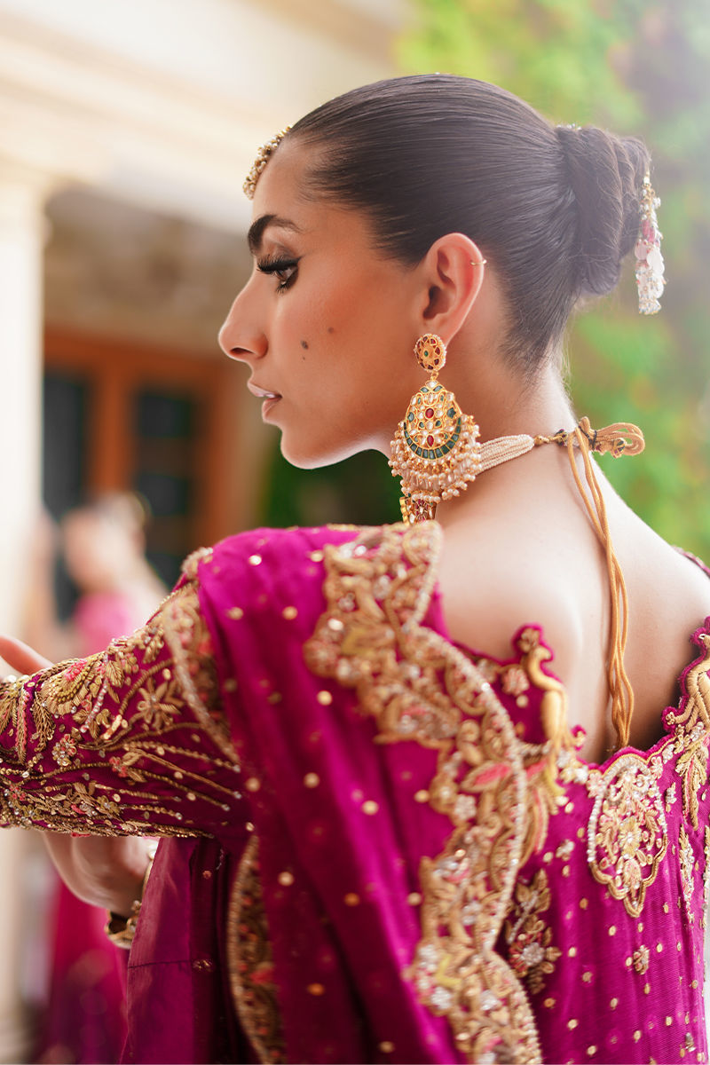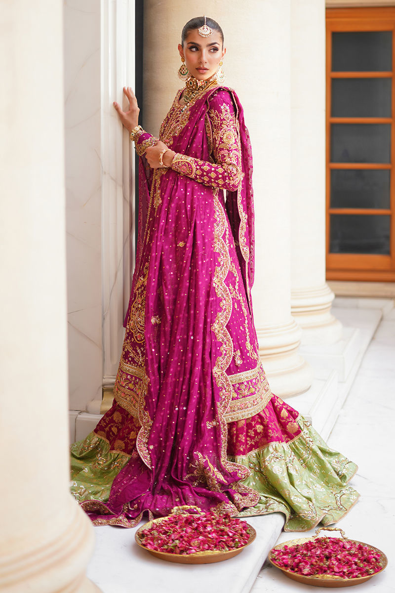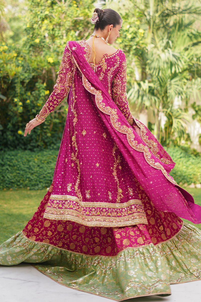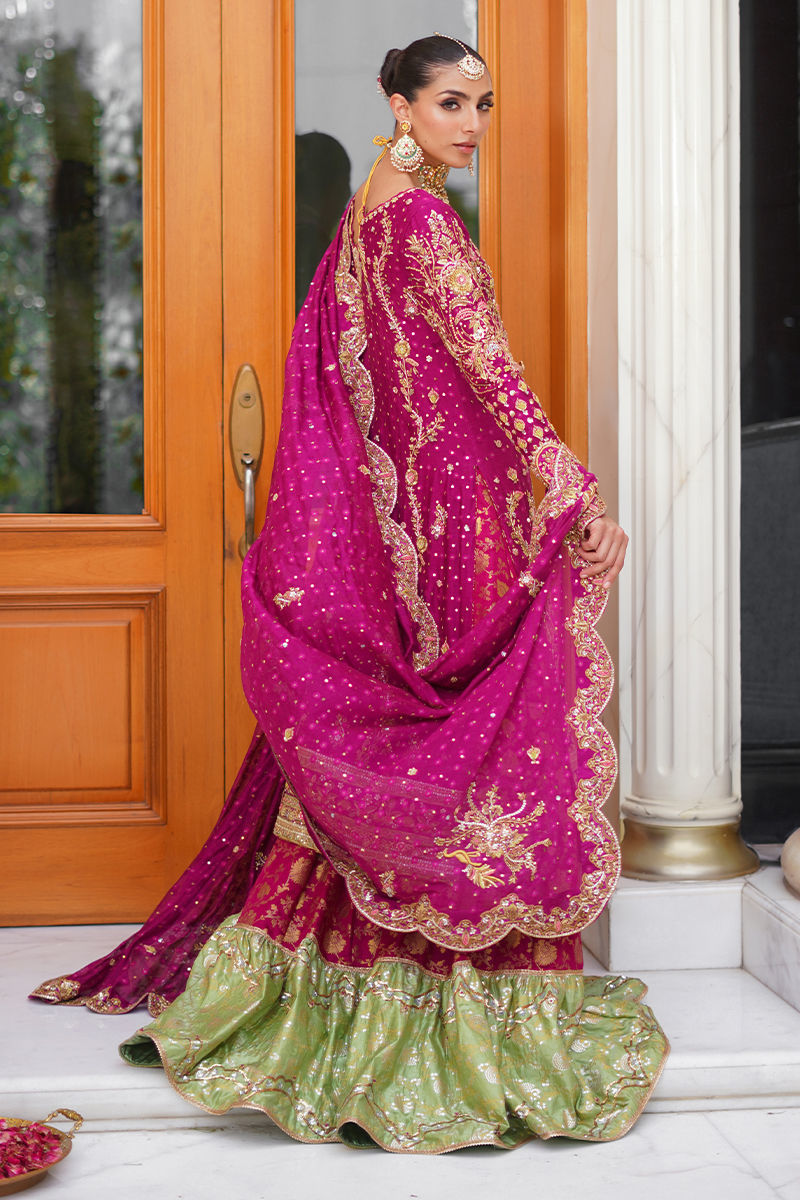 A striking expression of modern regality, this magenta-toned bridal is crafted from pure cotton net shirt and dupatta, lavishly adorned with intricate dabka, sitara, and Swarovski crystals, elevated with pink and green resham accents for a rich play of color. The ensemble is paired with a voluminous jamawar lehenga, where a bold green gharara adds an edgy contrast to the magenta base, creating a dramatic yet harmonious balance. This statement bridal look captures the essence of tradition while embracing a contemporary flair.