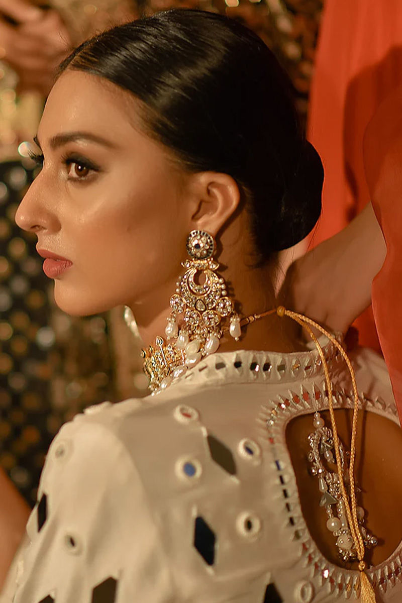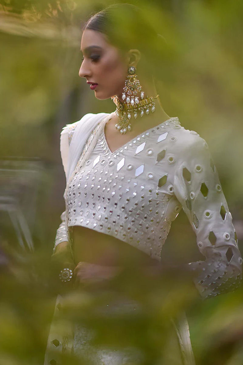 Our rania lengha in perfect hues of White is meticulously crafted with sheesha is paired with raw silk choli with detailed back along with jamawar lengha and net dupatta with mirror and lace finishing.