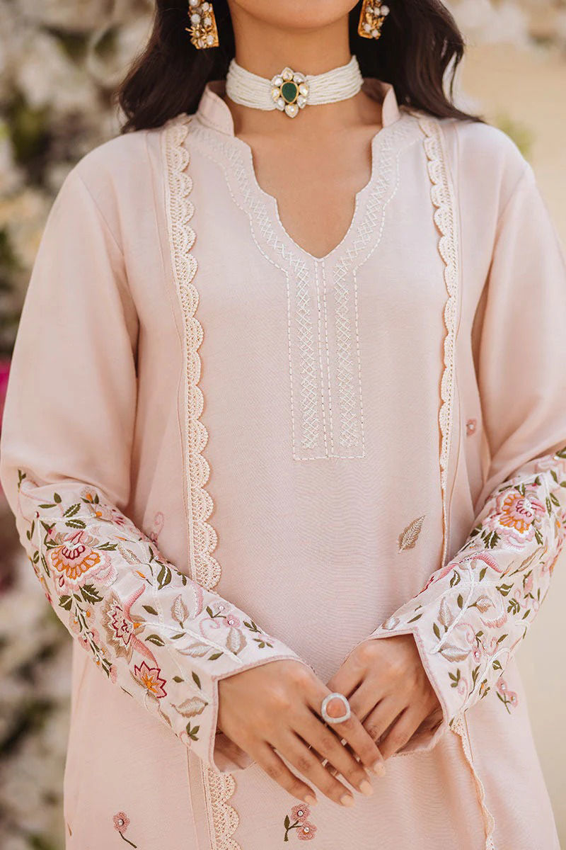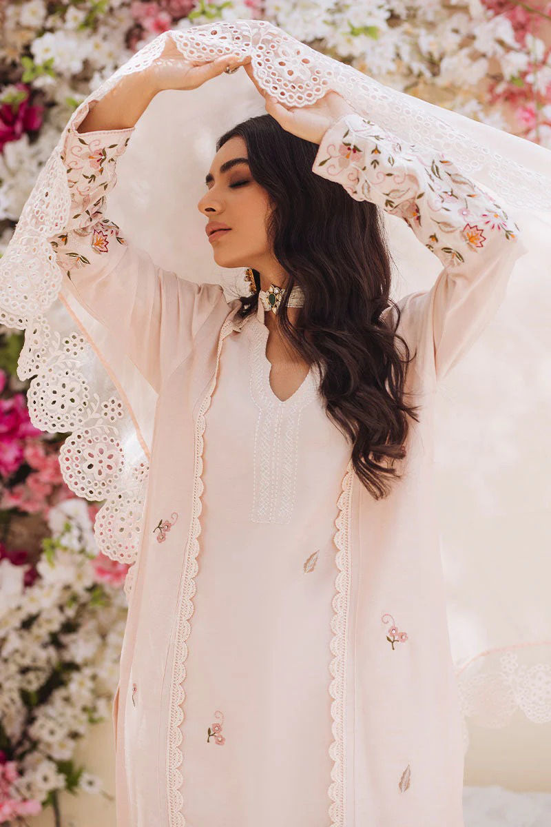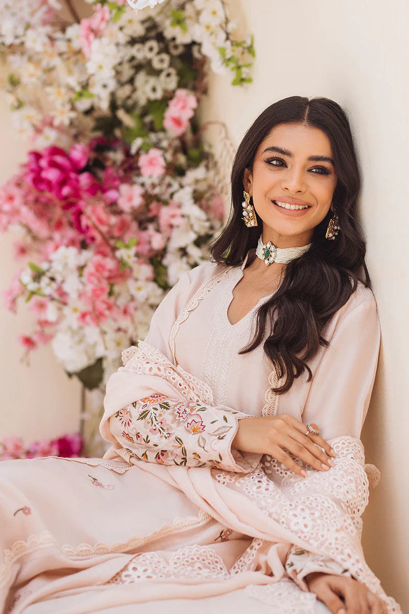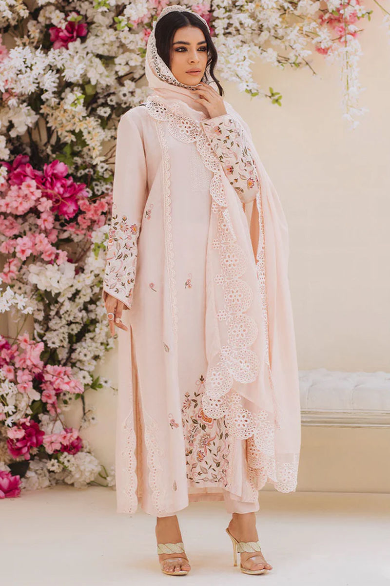 Iftars, Eid, and Milads just got sorted. A mellow pink imported silk shirt with stitch details on the neckline, beautiful embroidery on sleeves, and daman with Swarovski crystal details. Our in-house embroidered scallop and cutwork is appliquéd on chaak (side slits) and the shirt is finished off with scallop laces on the panel. The dupatta is on medium silk with our in-house cutwork scallop embroidery on four sides. You can pair it up with the imported plain silk pants to define the whole look.Shirt: SilkPant: Silk