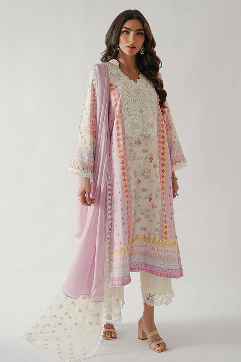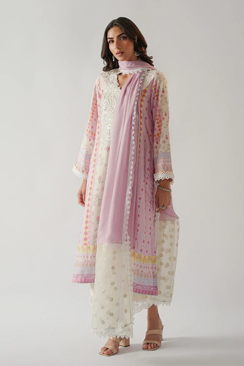 This elegant ensemble features a pink and ivory Khaddi Silk kurta, beautifully printed with intricate patterns that exude timeless charm. The soft pastel pink hue, complemented by delicate ivory accents, creates a refined, graceful appearance. The kurta is enhanced with intricate embroidery around the neckline, featuring floral or geometric motifs that add a sophisticated, artisanal touch to the design.Paired with the kurta is a luxurious tissue silk dupatta, which flows delicately with a subtle sheen. The dupatta is finished with embroidered organza pallo (borders) that elevate its elegance, adding a soft, ethereal touch to the outfit. Silk pants are an add on. Model height 5'10. Maximum length of shirt 48". Shirt: Khaddi Silk Dupatta: Tissue Silk Pant: Pure Rawsilk