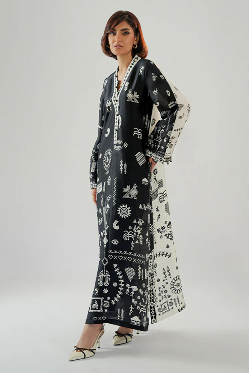 This black and ivory long cut pure rawsilk kurta is a sophisticated blend of bold elegance and ancient charm. Featuring intricate Egyptian motifs, the kurta’s detailed designs add a cultural richness to its modern silhouette. The striking contrast of the deep black fabric with the ivory motifs creates an eye-catching and refined look. Paired with straight black pantsas an add on , the outfit offers a sleek, elongated silhouette that exudes timeless sophistication. Whether for an evening event or a special occasion, this ensemble combines tradition with contemporary style, making a bold yet graceful statement. Model height 5'9, maximum shirt length 56"