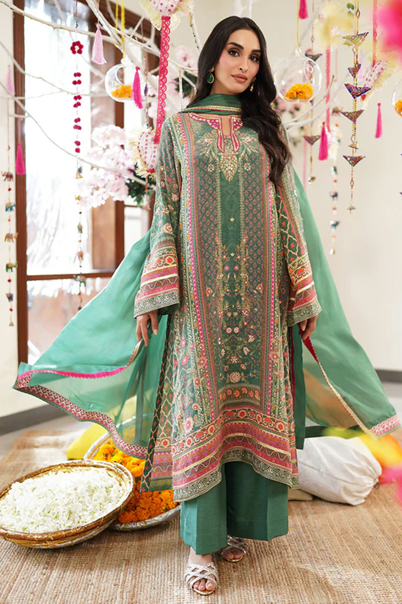 A refreshing green digital print on soft crepe forms the base of this elegant ensemble, elevated with vibrant pops of pink and yellow for a playful yet sophisticated touch. The shirt is further enhanced with delicate hand embellishments that add a subtle shimmer and bring the design to life.Paired with a luxurious tissue silk dupatta, featuring printed borders, contrast piping, and gota finishings, this outfit beautifully balances tradition with modern flair. Coordinated pants are available as an optional add-on to complete the look.Perfect for festive occasions or chic daytime gatherings.Shirt maximum length: 48Model height 5’5