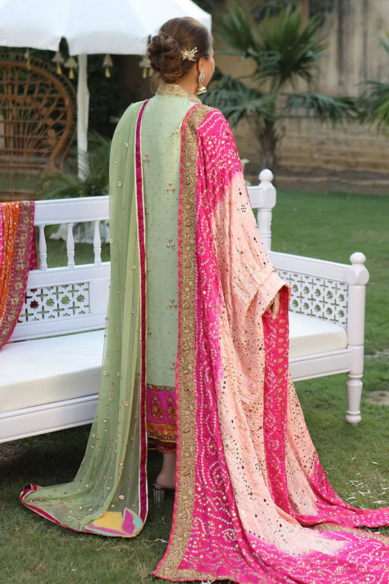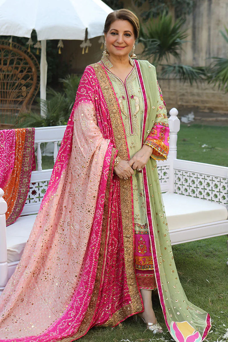 A Pure Festive ensemble Cut from pure raw silk shirt in a soothing shade of pistachio green. Handworked with finesse ( pita, Zardozi and French knot) with an eye catching discharge print sprinkled with gota and sitar work .A signature net dupatta laden with close chan and finished with Signature AA lotus flowers appliqué on four sides. Pants are in a contrasting shade of pink with details. You can pair this outfit with our classic handcrafted Chunri chadar seperately .Kundan jewellery and a messy bun would give a timeless appeal Shirt: Pure Raw Silk Dupatta: Pure Raw Silk Pant: Pure Raw Silk