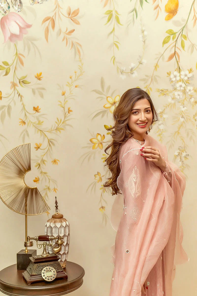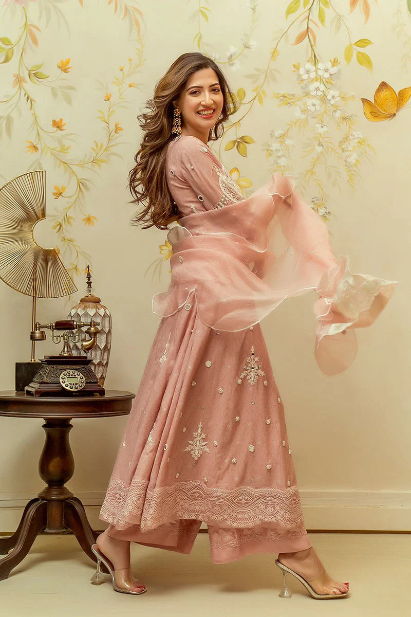 Beautifully embroidered and handcrafted kalidar in cotton net with mirror work and handwork details. It has our signature back. It is paired with a scalloped organza dupatta with hand work spray and lace detailing and statement pants. Perfect for an intimate wedding or any festive occasion.