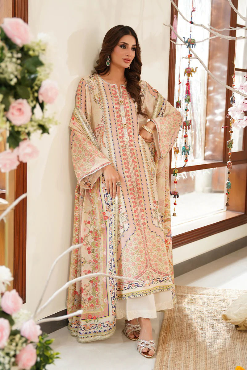 A soft vision in ivory, this pure raw silk ensemble features delicate floral prints in shades of pink, green, and blue — a perfect harmony of color and elegance. The print is tastefully elevated with hand embellishments that add subtle sparkle and depth, bringing the design to life with refined craftsmanship. The neckline is adorned with handmade pearly buttons, adding a touch of timeless charm and enhancing the overall femininity of the outfit. It is paired with a digitally printed crepe silk dupatta, adorned with intricate floral patterns and finished with gota lace for a traditional yet contemporary flair. An ivory pant is available as an optional add-on to complete the look with understated sophistication. Shirt maximum length: 50 Model height 5’8 Shirt: Pure Raw Silk Dupatta: Crepe Silk Pant: Pure Raw Silk