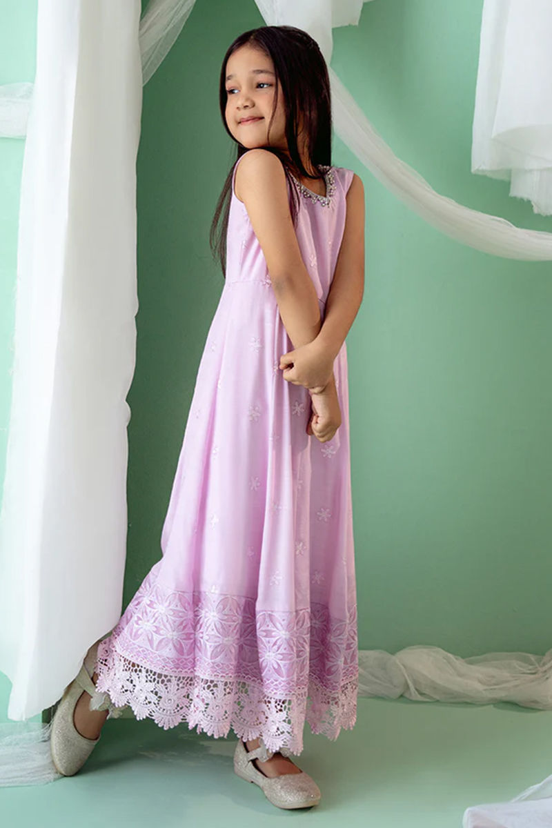 A regal kalidar crafted from in-house silk embroidered fabric, exuding luxury and craftsmanship. The fabric is rich and lustrous, showcasing intricate embroidery that adds depth and texture to the overall design. The neckline is beautifully hand-embroidered with delicate threadwork, adding a personalized touch of artistry and elegance to the piece. The hemline of the kalidar is meticulously surrounded with fine lace detailing, enhancing the garment’s sophisticated appeal and offering a seamless finish. The kalidar flows gracefully, with the classic cut and silhouette creating a flattering shape. The outfit is completed with silk pants, offering a perfect balance of comfort and style. Maximum shirt length: 36" , Model height : 3'9